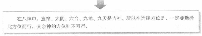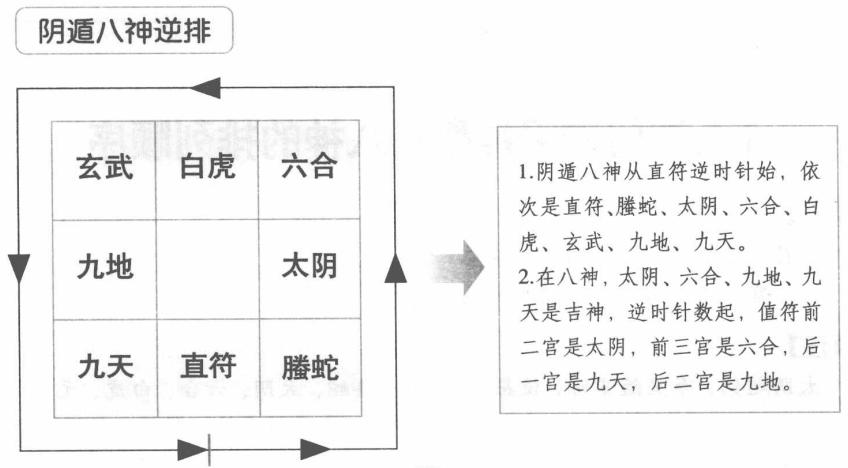 【原文】 值符前三六合位,太阴之神在前二。 后一宫中为九天,后二之神为九地。 【原注】 太阴起例,布星随本时,值符宫,值符、螣蛇、太阴、六合、白虎、元武、九地、九天。阳遁,值符宫所到之宫,加活局,值符顺布星。阴遁,值符宫所到之宫,加活局,值符逆布星。 【白话提要】 这里讲的是奇门遁甲顶盘之八诈门盘(神盘)上的太阴起例布星顺序。先用此盘的值符跟随转到天盘当时值符的位置上,然后再按阳顺阴逆的法则排布星相,这时值符前三宫是六合的位置,前二宫的太阴位置,后一宫为九天位置,后二宫为九地位置。按系统性顺序,阳遁时的排列按顺时针方向,从值符起,往下依次为螣蛇、太阴、六合、勾陈、(阴为白虎)、朱雀(阴为玄武)、九地、九天;阴遁时则逆时针方向,从值符起,往下仍是依次作上述排列布星。遁甲经上还有一首歌诀: 九天九地秘通神,太阴六合定乾坤。 能知此诀备于我,肯把三门别立根。 出向奇门分造化,人于心上表经纶。 守攻城负凭于此,道不虚行只在人。 此歌诀无非是渲染八诈门的神奇,并指出九天、九地、太阴、六合这四星是吉星。 八神的顺排与逆排 在奇门遁甲排中,位于最顶层的神盘,排布着八神,八神按阴遁和阳遁分为两种排布方法,下面就对其用图加以说明。 阳遁八神顺排 阴遁八神逆排 此信息最后更新时间为:2024-11-30 16:51
