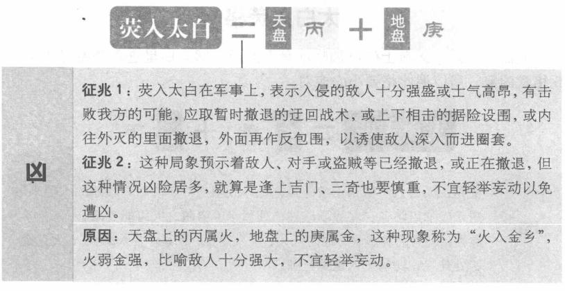 【原文】 六丙加庚荧入白。 荧入太白格 荧入太白是指天盘上的丙加临地盘上的庚,即荧惑星进入太白星的位置。此格是凶象,所以遇此格要小心应对。 【原注】 天丙加地庚,火入金乡,此时闻贼当退避。赤松子云:“荧入白,太白上下相击,内往外灭,以谗贼陷。”汤谓曰:“此时贼退。”又曰:“二星相入,凶气横任,得奇门慎勿行此星若也,移方去金火之神,是恶神上盘丙加下盘庚也。假令小满上元,用阳遁五局,丙辛之日黄昏时为戊戌时,此六戊在五宫,得天任值符,为六丙下临六庚于七宫,即荧惑入太白也。《奇门大全》云:“丙加下庚也。此时战,宜回避,不宜冲击。占贼来,信必虚诈。” 【白话提要】 奇门遁甲天盘上的丙加临到地盘上的庚时,称为“荧入白”之象,即荧惑星进入太白星的位置。天盘上的丙属火,地盘上的庚属金,这种现象称为“火入金乡”。在军事上,古人认为遇到“荧入白”的情况时,入侵的敌人十分强盛或士气高昂,有“克我”即击败我方的可能时,应取暂时撤退的迂回战术,或上下相击的据险设围,或内往外灭的里面撤退,外面再作反包围,以诱使敌人深入而进圈套。还有一种说法是,这种局象预示着敌人、对手或盗贼等已经撤退,或正在撤退,但这种情况凶险居多,就算是逢上吉门、三奇也要慎重,不宜轻举妄动以免遭凶。 例如小满上元用阳遁五局,丙、辛日,戊戌时,此时六壬排布在五宫,得天任星为值符,带六丙下临六庚于兑七宫,这种局象即是太白入荧惑之象。《奇门大全》中说的上盘丙加会下盘庚时,作战宜回避,不宜冲击,若如果用来预测敌方来函之类,则其中很可能有虚伪狡诈的阴谋。 从以上几段内容可以看出,在《奇门遁甲》中的确有不少内容涉及古代的军事活动。古代的人在战争中,当情况不明时,人们大多用此来进行卜测而做出行动;虽然这其中缺少科学依据,但从中也可了解到古代战争中的一些具体战术与谋略,以及领会到古人那种处处谨慎小心,忌讳轻举妄动,特别强调时时处处提高警惕,以防敌人袭击和避免中敌圈套的战争思想。 |