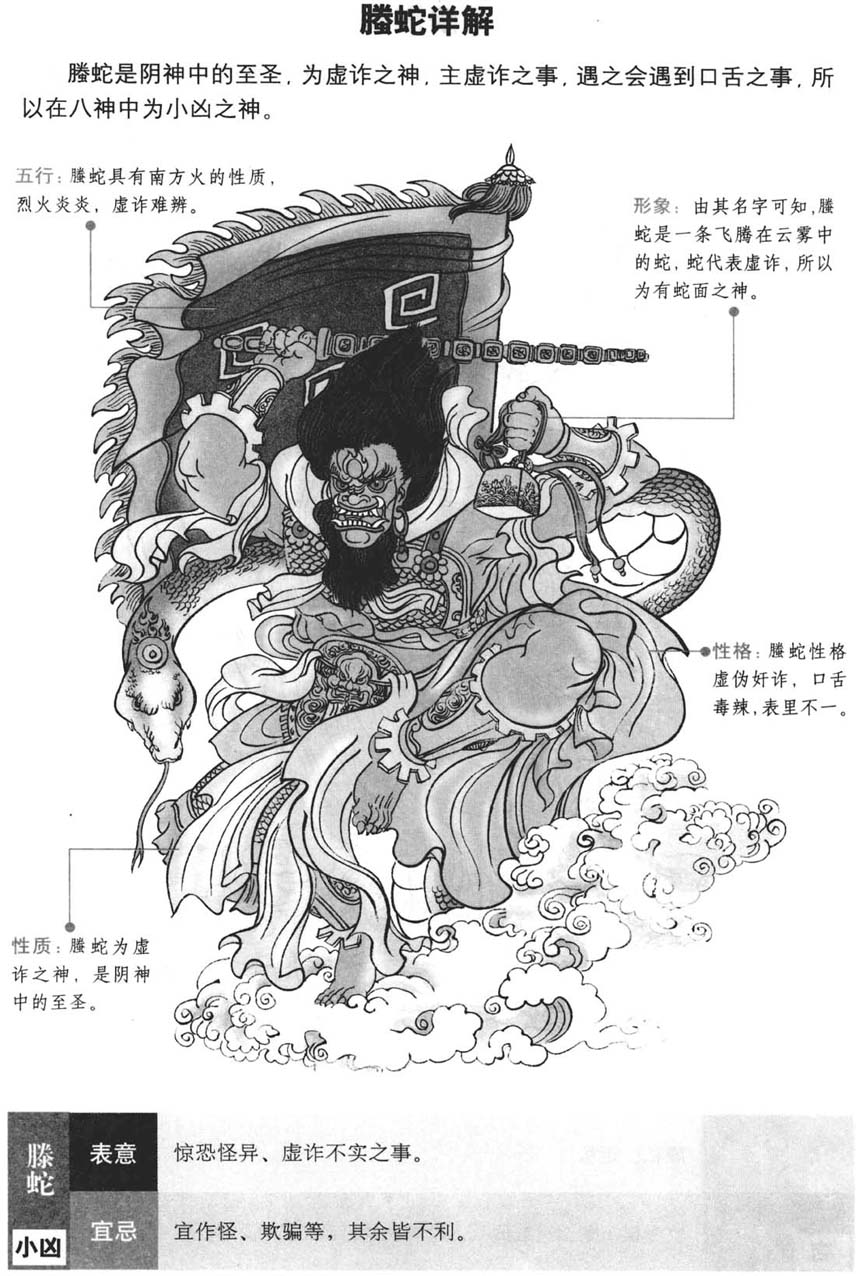 :螣蛇禀南方丙丁火,在奇门遁甲的八神体系中是虚诈之神。它具有火的特性,变化多端且捉摸不定。