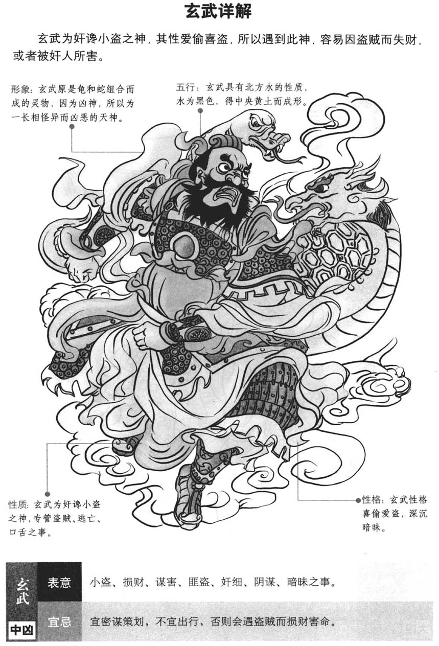 :玄武被称为奸馋小盗之神,性好阴谋贼害,专管盗贼、逃亡、口舌、欺诈等事.