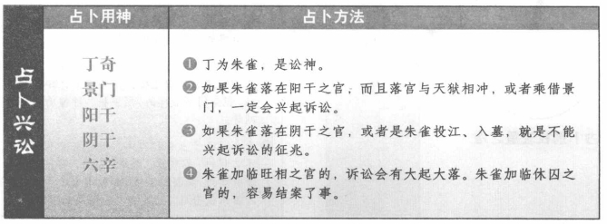 占兴讼时,丁为朱雀,是讼神。如果朱雀落在阳干之宫,而且落宫与天狱相冲,或者乘借景门,一定会兴起诉讼。如果朱雀落在阴干之官,或者是朱雀投江入墓,就是不能兴起诉讼的征兆。还有朱雀加临旺相之宫的,诉讼会有大起大落朱雀加临休囚之宫的,容易结案了事。