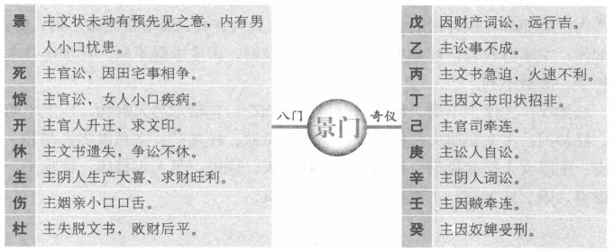 八门克应总述 所谓八门克应,有八门静应和八门动应之分,八门静应是指门加门、门加三奇六仪所形成的格局及其吉凶,主要用于占事。八门动应主要是门与门相对时,在出门等路上所遇到的兆应,主要用于择吉。关于八门克应还有多种说法,有的认为八门克应包括八门主应、八门静应和八门动应,所谓八门主应就是指八门自身所包含的信息。另外,有的八门静应还包括八门与八卦相对时所形成的格局和吉凶。以下所讲的内容,主要讲的是八卦静应,也就是门与门和门与三奇六仪所形成的格局和吉凶。 休门克应 休加休:求财、进人口、见贵人吉利,上任、修造亦大利。休加生:主得阴人财物,谒贵谋望,虽迟也吉。休加伤:上官喜庆,求财不得,有亲戚分产。变动事不吉。休加杜:主破财,失物难寻。休加景:主求文书印信事不至,反招口舌小凶。休加死:主文印官司事不吉,远行、僧道事不吉,占病凶。休加惊:主损财、招非、疾病、惊恐事。休加开:主开张店铺及见贵、求财等喜事,大吉。休加戊:财物和合。休加乙:求谋重不得,求轻可得。休加丙:文书和合喜庆。休加丁:百讼休歇。休加已:暗昧不宁,后吉。休加:文书词讼先结后解。休加辛:疾病迟愈,失物不得。休加壬、癸:阴人词讼牵连。 死门克应 死加死:主官事稽留,印信无气,凶。死加惊:主因官司不结,疑患病,凶。死加开:主见贵人,求印信文书事大利。死加休:主求财物事不吉,若问僧道求方吉。死加生:主丧事,求财得,占病死而复生。死加伤:主官司动而被刑杖,凶。死加杜:主破财,妇人风疾,腹肿。死加景:主因文契印信财产事见官,先怒后喜,不凶。 死加戊:主作伪财。死加乙:主求事不成。死加丙:主信息忧疑。死加丁:主老阳人疾病。死加已:主病讼牵连不已,凶,死加庚:主女人生产,母子俱凶。死加辛:主盗贼失脱难获。死加壬:主讼人自讼自招。死加癸:主妇女娶事凶。 伤门克应 伤加伤:主变动,远行折伤,凶。伤加杜:主变动、失脱、官司、梏,百事凶。伤加景:主文书印信,口舌,惹是生非。伤加死:主官司印信凶,出行大忌,占病凶。伤加惊:主亲人疾病忧惊,媒伐不利,凶。伤加开:主见贵人、开张、走失、变动之事,不利。伤加休:主男人变动或托人办事,财名不利。伤加生:主房产、种植事业,凶。 伤加戊:主失脱难获。伤加乙:主求谋不得,反防盗失财。伤加丙:主道路损失。伤加丁:主音信不至。伤加已:主财散人病。伤加庚:主沦狱被刑杖,凶。伤加辛:主夫妻怀私恣怨。伤加壬:主因盗牵连。伤加:主讼狱被冤,有理难申。 惊门克应 惊加惊:主疾病,忧虑,惊恐。惊加开:主官司忧疑,能见贵人不凶。惊加休:主求财事或口舌事,迟吉。惊加生:主因妇人生产或求财事惊忧,皆吉。惊加伤:主因商议同谋害人,事泄惹讼,凶。惊加杜:主因失脱破财惊恐,不凶。惊加景:主词讼不息,小口疾病,凶。惊加死:主因宅中怪异而生是非,凶。惊加戊:主损财,信阻。惊加乙:主谋财不得。惊加丙:主文书印信惊恐。惊加丁:主词讼牵连。惊加已:主恶犬伤人成讼。惊加庚:主道路损折,遇贼盗,凶。惊加辛:主女人成讼,凶。惊加壬:主官司囚禁,病者大凶。惊加:主被盗,失物难获。 景门克应 景加景:主文状未动有预先见之意,内有男人小口忧患。景加死:主官讼,因田宅事相争,惹麻烦。景加惊:主官讼,女人小口疾病,凶。景加开:主官人升迁,吉;求文印更吉。景加休:主文书遗失,争讼不休。景加生:主阴人生产大喜,更主求财旺利,行人皆吉。景加伤:主姻亲小口口舌。景加杜:主失脱文书败财后平。 景加戊:因财产词讼,远行吉。景加乙:主讼事不成。景加丙:主文书急迫火速不利。景加丁:主因文书印状招非。景加已:主官司牵连。景加庚:主讼人自讼。景加辛:主阴人词讼。景加壬:主因贼牵连。景加癸:主因奴受刑。 开门克应 开加开:主贵人宝物财喜。开加休:主见贵人财喜及开张铺店,贸易大利。开加生:主见贵人,谋望所求顺意。开加伤:主变动、更改、移徙,事皆不吉。开加杜:主失脱,刊印书契小凶。开加景:主见贵人,因文书不利。开加死:主官司惊扰,先忧后喜。开加惊:主百事不利。 开加戊:财名俱得。开加乙:小财可求。开加丙:贵人印绶。开加丁:远信必至。开加己:事绪不定。开加庚:道路词讼,谋为两。开加辛:阴人道路。开加壬:远行有失,注意破财。开加癸:阴人失财小凶。 生门克应 生加生:主远行、求财吉。生加伤:主亲友变动,道路不吉。生加杜:主阴谋,阴人破财,不利。生加景:主阴人、小口不宁及文书事,后吉。生加死:主田宅官司,病主难救。生加惊:主尊长财产、词讼,病迟愈,吉。生加开:主见贵人,求财大发。生加休:主阴人处求谋财利,吉。 生加戊:嫁娶、求财、谒贵皆吉。生加乙:主阴人生产,迟吉。生加丙:主贵人印绶、婚姻、书信喜事。生加丁:主词讼、婚姻、财利大吉。生加已:主得贵人维持,吉。生加庚:主财产争讼破产,不利。生加辛:主产妇疾病,后吉。生加壬:主遗失财后得,贼盗易获。生加癸:主婚姻不成,余事皆吉。 杜门克应 杜加杜:主因父母疾病、田宅出脱事,凶。杜加景:主文书印信阻隔,男人小口疾病,迟疑不利。杜加死:主田宅文书失落,官司破财,小凶。杜加惊:主门户内忧疑惊恐,并有词讼事。杜加开:主见贵人官长,谋事主先破已财,后吉。杜加休:主求财有益。杜加生:主男人小口破财,田宅求财不利。杜加伤:主兄弟相争,破财不利。 杜加戊:主谋事不成,秘