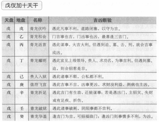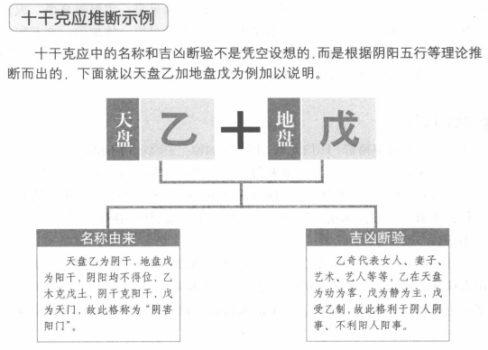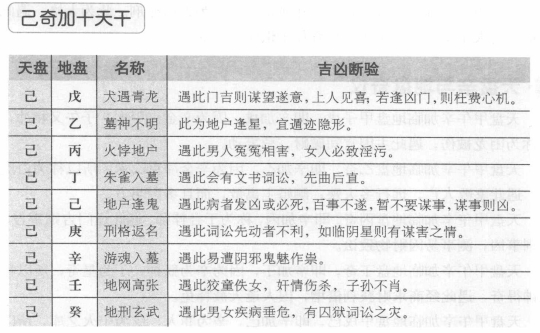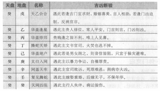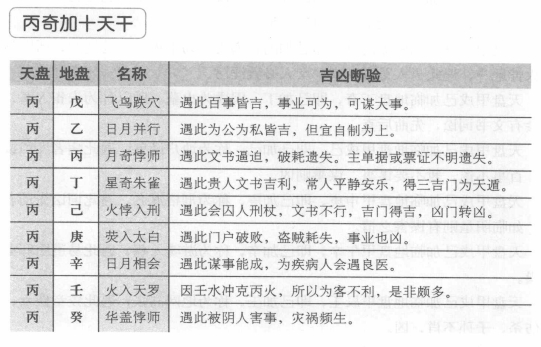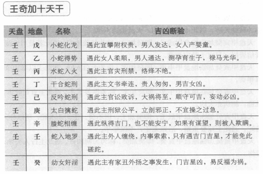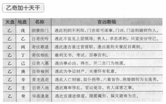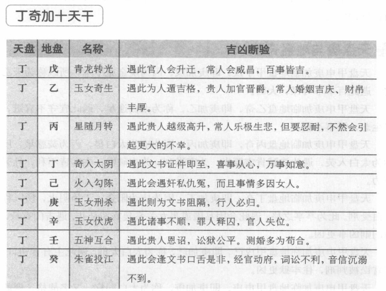 奇门克应 奇门占测的依据方法之一就是奇门克应,依据古籍所载,奇门克应大致上可以分为四类,即十干克应、八门克应、九星值时克应和三奇到宫克应,以下几节就分别加以说明。所谓十干克应,就是十个天干在天盘和地盘相遇后的各种克应关系。奇门遁甲将甲隐遁起来,其余九天干又分成三奇和六仪,所以也就是奇仪之间的克应关系。即天盘的乙丙丁戊已庚辛壬癸和地盘的乙丙丁戊已庚辛壬癸相遇后的各种关系。 念 天盘戊(甲)与地盘奇仪天盘甲子戊加临地盘甲子戊,即戊加戊,甲甲比肩,称为伏吟。遇此凡事不利,道路闭塞,以守为吉。 天盘甲子戊加临地盘乙奇,即戊加乙,甲乙会合,因为甲乙均位于东方青龙 之位,所以称为青龙和会,门吉事也吉,门凶事也凶。天盘甲子戊加临地盘丙奇,即戊加丙,因为青龙甲木生助丙火,所以称为青龙返首,遇此谋事,则大吉大利。但如果遇到迫、墓、击、刑,就会吉事成凶。天盘甲子戊加临地盘丁奇,即戊加丁,因为甲木青龙生助丁火,所以称为青龙耀明,遇此宜见上级领导、贵人、求功名,为事吉利。但如果遇到墓、迫,则会招惹是非。 天盘甲子戊加临地盘甲戌已,即戊加已,因为成为戊土之墓,所以称为贵人入狱,遇此公私都不利。 天盘甲子戊加临地盘甲申庚,即戊加庚,因为值符甲最怕庚金克杀,所以称为值符飞宫,遇此吉事不吉,凶事更凶,求财没利益,测病也主凶。同时,甲庚相冲,飞宫也主换地方。 天盘甲子戊加临地盘甲午辛,即戊加辛,因为辛金克甲木,子午相冲,所以称为青龙折足,遇此吉门有生助,还能谋事;若是遇凶门,主招灾、失财或有足疾、折伤。 天盘甲子戊加临地盘甲辰壬,即戊加壬,因为壬为天牢,甲为青龙,所以称为青龙破狱,遇此阴阳事都不吉利。 天盘甲子戊加临地盘甲寅癸,即戊加癸,因为甲为青龙,为天网,又为华盖,所以称为青龙华盖,又因为戊癸相合,所以逢吉门为吉,可招福临门;逢凶门则事情多不利,为凶。 天盘乙与地盘奇仪 天盘乙奇加临地盘甲子戊,即乙加戊,因为乙木克戊土,戊为阳为天门,所以称为阴害阳门,遇此利于阴人、阴事,不利阳人、阳事,门吉尚可谋事,门凶门迫则破财伤人。 天盘乙奇加临地盘乙奇,即乙加乙,乙乙比肩,称为日奇伏吟,遇此不宜见上层领导、贵人,求名求利,只宜安分守己。 天盘乙奇加临地盘丙奇,即乙加丙,因为乙木生丙火,所以称为奇仪顺遂。遇此逢吉星迁官晋职,逢凶星则夫妻反目离别。 天盘乙奇加临地盘丁奇,即乙加丁,,因为乙木生丙火,所以称为奇仪相佐,最利文书、考试,百事吉利。 天盘乙奇加临地盘甲戌已,即乙加已,因为成为乙木之墓,所以称为日奇人幕,因乙木被土暗昧,所以遇凶事必凶,得生、开二吉门为地遁,天盘乙奇加临地盘甲申庚,即乙加庚,因为庚金克刑乙木,所以称为日奇被刑。遇此为争讼财产,夫妻怀有私意。 天盘乙奇加临地盘甲午辛,即乙加辛,因为乙为青龙,辛为白虎,乙木被辛金冲克而逃,所以称为青龙逃走,遇此人亡财破,奴仆拐带,六畜皆伤。测婚姻则为女逃男。 天盘乙奇加临地盘甲辰壬,即乙加壬,因为壬为天牢,所以称为日奇入地,遇此尊卑悖乱,官讼是非,有人谋害之事。 天盘乙奇加临地盘甲寅癸,即乙加癸,因为癸为华盖,所以称为华盖逢星,遇此宜遁迹修道,隐匿藏形,躲灾避难为吉。 天盘丙与地盘奇仪 天盘丙奇加临地盘甲子戊,即丙加戊,因为甲为丙火之母,丙火回到母亲身边,好似飞鸟归巢,所以称为飞鸟跌穴,遇此百事皆吉,事业可为,可谋大事。天盘丙奇加临地盘乙奇,即丙加乙,因为丙为月奇,乙为日奇,所以称为日月并行,遇此为公为私皆吉。 天盘丙奇加临地盘丙奇,即丙加丙,称为月奇悖师,遇此文书逼迫,破耗遗失。主单据或票证不明遗失。 天盘丙奇加临地盘丁奇,即丙加丁,称为星奇朱雀,遇此贵人文书吉利,常人平静安乐,得三吉门为天遁。 天盘丙奇加地盘甲戌已,即丙加已,因为丙火入戌墓,称为火悖入刑,遇此会囚人刑杖,文书不行,吉门得吉,凶门转凶。 天盘丙奇加临地盘甲申庚,即丙加庚,因为丙为荧惑星,庚为太白星,所以称为荧入太白,遇此门户破败,盗贼耗失,事业也凶。 天盘丙奇加临地盘甲午辛,即丙加辛,因为丙辛相合,所以称为日月相会。遇此谋事能成,为疾病人会遇良医。 天盘丙奇加临地盘甲辰壬,即丙加壬,因为丙为阳火,壬为天罗,所以称为火入天罗。因壬水冲克丙火,所以为客不利,是非颇多。 天盘丙奇加临地盘甲寅癸,即丙加癸,称为华盖悖师,遇此被阴人害事,灾祸频生。 天盘丁与地盘奇仪 天盘丁奇加临地盘甲子戊,即丁加戊,称为青龙转光,遇此官人会升迁,常人会威昌,百事皆吉。 天盘丁奇加临地盘乙奇,即丁加乙,因为丁为玉女,所以称为玉女奇生。遇 此为人遁吉格,贵人加官晋爵,常人婚姻吉庆、财帛丰厚。天盘丁奇加地盘丙奇,即丁加丙,因为丁为星奇,丙为月奇,所以称为星随月转,遇此贵人越级高升,常人乐极生悲,但要忍耐,不然会引起更大的不幸。天盘丁奇加临地盘丁奇,即丁加丁,称为奇入太阴,遇此文书证件即至,喜事从心,万事如意。 天盘丁奇加地盘甲戌已,即丁加已,因戌为火库,已为勾陈,所以称为火入勾陈,遇此会遇奸私仇冤,而且事情多因女人。 天盘丁奇加临地盘甲申庚,即丁加庚,因为丁为阴火为玉女,庚为阳金,火克金,所以称为玉女刑杀。因丁为文书,庚为阻隔之神,遇此则为文书阻隔,行人必归。 天盘丁奇加临地盘甲午辛,即丁加辛,称为玉
