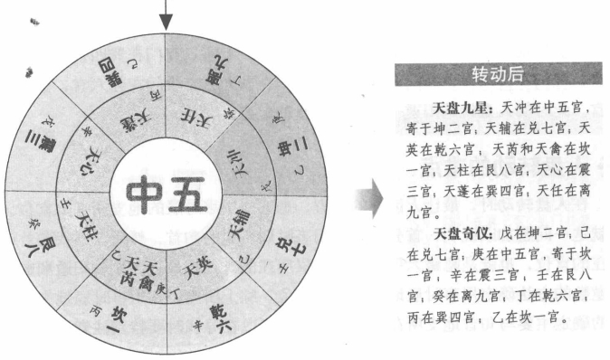 天盘的转动方法 在找到了值符和值使后,就要开始转动天盘、人盘和神盘,这就介绍天盘的转动方法。天盘上排布的是九星和九颗奇子,九星的原始位置是天蓬星在坎一宫;天芮星在坤二宫;天冲星在震三宫;天辅星在四宫;天禽星在中五宫,于坤二宫;天心星在乾六宫;天柱星在兑七宫,天任星在民八宫,天英星在离九宫。奇子的原始位置与地盘上奇子的排布一样。 以上是天盘上的原始排布,在转动时,先要寻找用事时间的时辰的天干被排布在哪一宫,然后将值符对准这一宫的方位,这样天盘就完成了转动。此时天盘上的九星和奇子的位置都发生了变动,天盘成为此时辰的定局。 天盘转动示例 下面通过具体的例子来说明天盘的转动方法。比如,冬至上元,丙日,辛卯时用事,查得此时用阳遁一局。九星的原始宫位是:天蓬星在坎一宫,天芮星在坤二宫;天冲星在震三宫;天辅星在巽四宫;天禽星在中五宫,寄于坤二宫;天心星在乾六宫;天柱星在兑七宫,天任星在民八宫;天英星在离九宫。奇子的原始宫位是:戊在坎一宫;已在坤二宫:庚在震三宫;辛在四宫,壬在中五宫,寄于坤二宫;癸在乾六宫,丁在兑七宫;丙在民八宫,乙在离九宫。 首先确定旬首,辛卯时的句首是甲申,甲申隐藏在庚下,庚在震三宫。然后确定值符,由于旬首在震三宫,则值符就是天冲星。最后值符转到时辰的天干所在的宫位,辛卯时的天干“辛”在巽四宫,则值符天冲星就转到四宫。 天盘转动后,九星的定局宫位是:天蓬星在民八宫,天芮星在兑七宫,天冲星在巽四宫;天辅星在离九宫:天禽星在中五宫,寄于兑七宫,天心星在坎一宫;天柱星在乾六宫,天任星在震三宫;天英星在坤二宫。奇子的定局宫位是:戊在民八宫:已在兑七宫,庚在巽四宫;辛在离九宫;壬在中五宫,寄于兑七宫;在坎一宫,丁在乾六宫;丙在震三宫;乙在坤二宫。此时的天盘就是阳遁一局辛卯时的定局。 天盘转动示例详解 找到天盘值符和值使后,奇门适甲的天盘就可以转动,下面就通过阳遁三局庚午时为例加以说明。 |