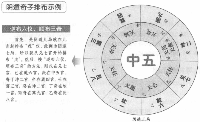 奇子排布方法 确定了局数后,接下来就要排布两副奇子,每副奇子九枚,即三奇乙、丙、丁和六仪戊、己、庚、辛、壬、癸。这两副奇子,一副排布在地盘上,一副排布在天盘上。在阳遁局时,顺布六仪,逆布三奇,在阴遁局时,逆布六仪,顺布三奇在具体排布时,可以依照戊、己、庚、辛、壬、癸、丁、丙、乙的顺序,阳遁局时顺时针排布,阴遁局时逆时针排布即可。也就是说,戊永远挨着己,已永远挨着庚,庚永远挨着辛,辛永远挨着壬,壬永远挨着癸,永远挨着丁,丁永远挨着丙,丙永远挨着乙,乙永远挨着戊,无论谁在前、谁在后,这种顺序是不变的。 季 奇子的具体排布 确定阳遁几局或阴遁几局后,六仪中的戊就排布在几宫,如阳遁三局,戊在排布在震三宫,然后按顺序排布奇子。排布奇子之前,最好先将天盘和人盘转到其原始宫位,以备后面按方法进行转动。因为地盘是不动的,所以在布好奇子后它是固定的。因为天盘后面将要转动,所以天盘在按原始宫位布好奇子后,会随着天盘的转动而转动。 奇子排布示例 下面通过具体的示例来说明奇子的排布方法。如用事时间属于冬至后,雨水节气,下元,查得甲子起宫数为三。那么就将第一对奇子“戊”排布在震三宫和相应的天盘的天冲是上。冬至后用阳遁顺局,所以第二对奇子“已”应排在巽四宫和相应天盘上的天辅星上。依此类推,第三对奇子“庚”应排布在中五宫和天禽星上,但因中五宫无位,所以都寄处在坤二宫和天芮星上。第四对奇子“辛”应排布在乾六宫和天心星上。第五对奇子“壬”应排布在兑七宫和天柱星上。第六对奇子“癸”就排布在民八宫和天任星上。第七对奇子“丁”应排布在离九宫和天英星上。第八对奇子“丙”应排布在坎一宫和天蓬星上。第九对奇子“乙”应排布在坤二宫和天芮星上。如果是阴遁局,则是依顺序逆布奇子,比如阴遁九局,从九宫到一宫布奇子戊、已、庚、辛、壬、癸、丁、丙、乙。 奇子排布示例 奇门遁甲在确定局数之后,就要在天盘和地盘排布两副奇子,下面就通过具体的例子来说明阳遁奇子和阴遁奇子的排布。 |