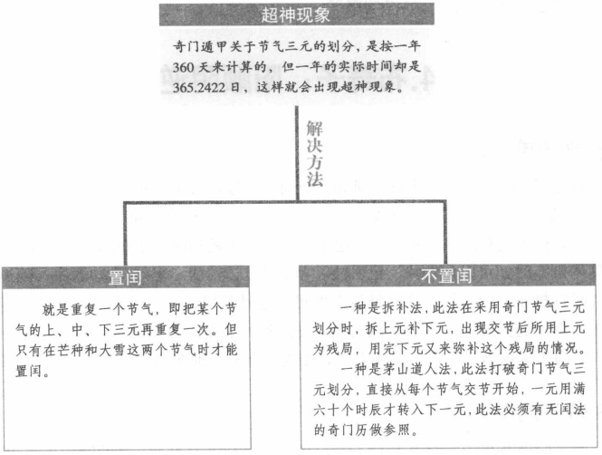 二至分顺逆 确定了预测的时间后,就要据此来确定局数。首先就是要分阳遁局和阴遁局其方法是:用事的时间在冬至以后的,用“阳遁顺局”;用事的时间在夏至以后的,用“阴遁逆局”。用阳遁局的节气是:冬至、小寒、大寒、立春、雨水、惊蛰、春分、清明、谷雨、立夏、小满、芒种。用阴遁局的节气是:夏至、小暑、大暑、立秋、处暑、白露、秋分、寒露、霜降、立冬、小雪、大雪。 节气定三元 阴阳遁各有九局,共十八局,在确定了是阴遁局还是阳遁局后,就要确定其具体的局数。这就要用所用时间的节气来确定三元,以此来确定其具体的局数。年有二十四节气,那么每月就有两个节气,每个节气又有三候,一候即一元,则一个节气就有上、中、下三元。每一元分管五天,每个节气分管十五天。用事之日属于哪一节气,一般可从历书中查得,用事之日属于哪一元,则要用这一日的干支去查对六十甲子。六十甲子按五天一元来计算,可得到十二个符头,即甲子、己巳,甲戌、已卯,甲申、已丑,甲午、已亥,甲辰、已酉,甲寅、已未。其中凡属甲子、已卯和甲午、已酉四个符头统领的干支,为上元,凡属已巳、甲申和己亥、甲寅四个符头统领的干支,为中元,凡属甲戌、已丑和甲辰、已未四个符头统领的干支,为下元。 阴阳遁局数 奇门遁甲排盘在定时后,就要确定其阴阳遁的局数,其方法是根据节气三元来确定,具体可参照下图,直接查得即可。 起宫歌诀 在确定了三元后,就可以确定其局数,具体可用下面的两首歌诀。阳遁顺局起局歌诀是:“冬至惊蛰一七四,小寒二八五相随,大寒春分三九六,芒种六三九是仪,谷雨小满五二八,立春八五二相宜,清明立夏四一七,雨水九六三为期。阴遁逆局起局歌诀是:“夏至白露九三六,小暑八二五之间,大暑秋分七一四,霜降小雪五八二,大雪四本一相关,处暑排来一四七,立冬寒露六九三。”这两首歌诀说的是,用事时间节气后的三个数字,代表着上、中、下三元所应起之宫位,比如冬至或惊蛰节气,上元用阳遁一局,中元用阳遁七局,下元用阳四局。 超神现象 奇门遁甲关于节气三元的划分,是按一年360天来计算的,但一年的实际时间却是365.2422日,每个节气平均为15.2148日,不是正好十五天,这样每个节气交节的那一天,并不能都与符头的日干碰到一起,就会出现符头跑在节气前边的现象,称为“超神” 置闰 在奇门遁甲中,先是出现节气和符头正相对的现象,称为正授,但这种情况不是太多。接着便会出现超神现象。这种差距有时只有一两天,有时四五天,最多可达九天以上,此时就要置闰。所谓置闰,就是重复一个节气,即把某个节气的上、中、下三元再重复一次。但并不是出现超神现象时就置闰,只有在芒种和大雪这两个节气时才能置闰,这是因为这两个节气恰好在冬至和夏至之前,在二至之前的节气置闰,就是在阴阳遁开始之前把符头调整好,使头和节气尽量接近,而不致超过得过多。如果在别的节气置闰,就容易使阴阳混淆。经过置闰后,又会出现节气跑到符头前面的现象,称为接气。但经过一段时间后,又会出现正授,如此循环下去,从此保证奇门遁甲预测的准确性。 不置闰 也有少数人不主张置闰,但为了解决超神现象,主要有两种方法。一种是拆补法,此法仍然把上、中、下三元放在一个节气之中,而且仍采用三元的确定方法,但由于多数情况下是超神,所以从交节以后所用上元天数必然不满五天,这就叫拆。到了交下一个节气之前,用完下元之后,一般还有两三天可以用来补上元所缺的天数,这就叫补。还有一种方法是,直接从每个节气的交节时开始,即用本节气遁甲上元局,上元用满六十个时辰转入中元,中元用满六十个时辰转入下元。这样就打破了根据日干支符头确定三元的规律。而且还会出现遁甲下元有所取舍的情况,即前一个节气下元尚未用完六十个时辰,节气一到就停止不用,即要舍弃一部分时间,前一个节气下元已用完六十个时辰,下个节气尚未到,仍需继续用前一个节气下元,这就叫做取。 超神的解决方法 上面所讲的阴阳遁局数的查找方法并不是万能的,中间会出现超神现象致使奇门遁甲的预测出现误差,下面就讲解几种解决方法。 |