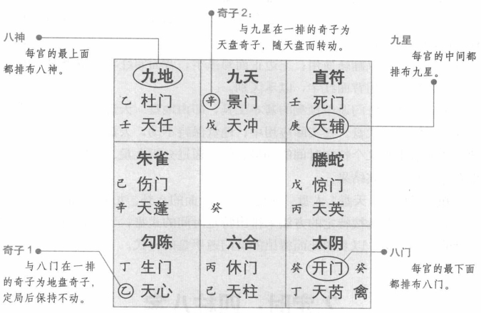 式盘 奇门遁甲作为三式之一,其预测吉凶祸福的主要工具就是式盘。式盘是古代推算历数或占卜的工具。式盘一般分为天盘和地盘。天盘为圆形,地盘为正方形,象征天圆地方。上面画有北斗和二十八宿的星象和方位,并刻有一百八十二个圆点,代表周天度数的三百六十五又四分一度。在实际的占卜中,将圆盘重合在方盘上,转动圆盘来进行占卜。 奇门遁甲盘 与一般所用的式盘不同,奇门遁甲所用的式盘由从大到小的四个圆盘组成四个圆盘同一轴心,从大到小依次叠合。每个盘上都划分为八个等分,则每一等分为四十五度角。其中最顶上的盘又分为阳面和阴面,可以翻转使用。 奇门四盘 奇门遁甲的预测工具是式盘,奇门遁甲盘由地盘、天盘、人盘和神盘这四个盘组成的,下面就通过具体的盘式来说明其构成。 奇子:就是两副三奇六仪,每副九枚,即乙、丙、丁三奇和戊、已、庚、辛、壬、癸六仪,共十八枚。两副奇子,一副布于地盘,一副布于天盘,地盘奇子随地盘不动,天盘奇子随天盘转动。 奇门遁甲所用的四个圆盘从下往上,从大到小,依次是地盘、人盘、天盘和神盘,神盘又称顶盘或八诈门盘。在实际的应用中,为了布局与演局的操作方便通常将天盘加大,人盘缩小,将人盘和天盘的位置互换,古人就是据此来制作奇门遁甲盘的。 地盘概说 地盘是在《周易》中“后天八卦”的基础上形成的,上离下坎,左震右兑,民巽、坤、乾在四角。如果从方位和数字上来说,则坎一,居北;离九,居南,震三居东,兑七,居西;坤二,居西南;民八,居东北;四,居东南;六,居西北。两两相对之和都是十,中宫数为五,因中宫无位,所以寄处于坤二宫。如果将地盘看作方形,就变成九宫格的形式。 地盘中,从坎一宫开始,顺时针依次排列着天蓬、天任、天冲、天辅、天英天芮、天柱、天心八星。因中五宫天禽无位,所以寄处于坤二宫,这是九星的“原定之位”。 此外,从坎一宫开始,顺时针依次排列着休门、生门、伤门、杜门、景门、死门、惊门、开门这八门,这是八门的“原定之位”。 此外还可以标上刑、制、墓等字样,表示各种禁忌,以便布局演局时观察。还可以写上各自的五行属性,便于分析和理解。地盘虽然没有做成方形,但地盘的确是静止不动的,只有它上面的三个盘随时间而转动。 天盘概说 与地盘相比,天盘上所需要的东西就少了许多,主要是从坎一宫开始,顺时针依次排列着天蓬、天任、天冲、天辅、天英、天芮和天禽、天柱、天心这天上的九星。如果在天盘上再分别写上九星各自的五行属性,那么在布局和演局时就会更为方便观察和分析。天盘九星的转动方法是值符随时干所指示的方位而转动。 人盘概说 人盘与天盘一样,也不需要太多的东西,从坎一宫开始,顺时针依次排列着休门、生门、伤门、杜门、景门、死门、惊门、开门这八门,人盘八门的转动方法是值使随时支所指示的方位而转动。 神盘概说 神盘又称八诈门盘,分为阴阳两面。神盘是奇门遁甲中最上面、最小的盘,这样便于翻转使用。神盘的阳面上从直符开始,顺时针依次排列着直符、蛇、太阴、六合、勾陈、朱雀、九地、九天这八神。神盘的阴面上也从直符开始,逆时针依次排列着直符、螣蛇、太阴、六合、白虎、玄武、九地、九天这八神。神盘八神的转动方法是直符随着天盘值符的方位而转动。 奇门方盘 奇门遁甲的盘式除圆盘外,还有方盘。方盘是依据九宫格而排布九星,八门八神、和奇子,下面就用具体的例子来说明。 1.九宫格:方盘九宫的排布是:载九履一,左三右七,二四为肩,六八为足. 2.地盘八卦:奇门遁甲方盘中没有显示地盘八卦,所以用此盘时需要记住八卦的宫位. 3.中宫无位:无论是奇门遁甲圆盘还是方盘,中五宫都无位,所以在中五宫的星和门都寄于坤二宫。 4.盘无定式:奇门遁甲方盘每宫的排布方法不一,此种排布只是其中之一。 奇子 除以上提到的地盘、天盘、人盘和神盘这四个盘外,奇门遁甲中还用到两副奇子。就是两副三奇和六仪,一副放在地盘上,一副放在天盘上,每副奇子共有九枚,两副共十八枚。 每个奇子都可以翻转使用,上边正而写黑字,背而写红字,每当遇上值符的时候,就要翻转使用背面红字,以示区别。 以上所述就是奇门遁甲预测的基本工具,即由地盘、天盘、人盘和神盘四个盘组成的奇门遁甲式盘。在实际应用中,地盘保持不动,天盘、地盘和神盘通过转动方法最后求得某个特定时间的局势,然后通过分析九星、八门、八神和奇子的排布方式来确定其结果。 在知道了地盘、天盘、人盘、神盘,以及上面的八卦、九星、八门、八神、三奇六仪后,就要开始按特定的方法来排出特定时间的式盘,下面几节就是具体讲每个盘的转动方法,以及由此而得出的奇门遁甲盘的样式。 |