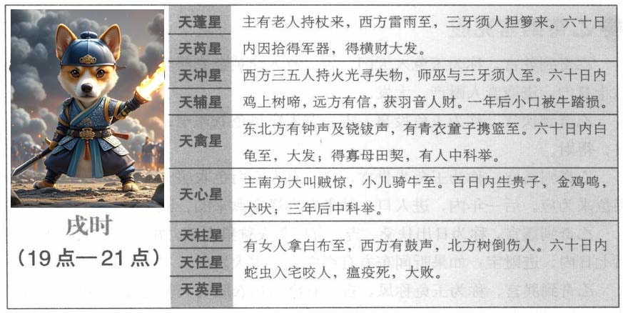 九星值戌时克应 天蓬星和天芮星值戌时,主有老人持杖来,西方雷雨至,三牙须人担箩来。葬造后,有白犬至。六十日内,因拾得军器,得横财大发。 天冲星和天辅星值戌时,西方三五人持火光寻失物,师巫与三牙须人至。葬造后六十日,鸡上树啼,远方有信,获羽音人财。一年后,小口被牛踏损。 天禽星值戌时,东北方有钟声及铙钹声,有青衣童子携篮至。葬造后六十日,白龟至,大发;得寡母田契,有人中科举。 天心星值戌时,主南方大叫贼惊,小儿骑牛至,葬造后百日内,生贵子,金鸡鸣,犬吠,三年后,中科举。 天柱星、天任星和天英星值戌时,有女人拿白布至,西方有鼓声,北方树倒伤人为应。葬造后六十日,蛇虫入宅咬人,瘟疫死,大败。 此信息最后更新时间为:2024-12-12 09:09 |