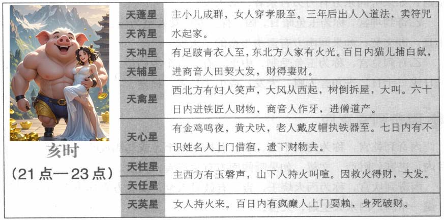 九星值亥时克应 天蓬星和天芮星值亥时,主小儿成群,女人穿孝服至。葬造后,因捉贼得财谷。三年后,出人入道法,卖符咒水起家。 天冲星和天辅星值亥时,有足跛青衣人至,东北方人家有火光。葬造后百日内,猫儿捕白鼠,进商音人田契大发,财得妻财。 天禽星值亥时,西北方有妇人笑声,大风从西起,树倒拆屋,大叫。葬造后六十日内,进铁匠人财物,商音人作牙,进僧道产。 天心星值亥时,有金鸡鸣夜,黄犬吠,老人戴皮帽执铁器至。葬造后七日内,有不识姓名人上门借宿,遗下财物去。 天柱星和天任星值亥时,主西方有玉磬声,山下人持火叫喧。葬造后,因救火得财,大发。 天英星值亥时,女人持火来。造葬后百日内,有疯癫人上门耍赖,身死破财。 |