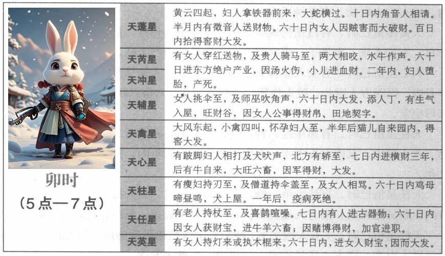 九星值卯时克应 天蓬星值卯时,黄云四起,妇人拿铁器前来,大蛇横过。造葬后十日内,角音人相请。半月内,有徵音人送财物。六十日内,女人因贼害而大破财。百日内,拾得窖财大发。 天芮星和天冲星值卯时,有女人穿红送物,及贵人骑马至,两犬相咬,水牛作声。造葬后六十日,进东方绝户产业,因汤火伤,小儿进血财。二年内,妇人堕胎,产死。 天辅星值卯时,女人挑伞至,及师巫吹角声,葬造后六十日,大发,添人丁,有生气入屋,旺财谷,因女人公事得财帛、田地契字。 天禽星值卯时,大风东起,小禽四叫,怀孕妇人至,造葬后半年,猫儿自来园内,得窖大发。 天心星值卯时,有跛脚妇人相打及犬吠声,北方有轿至,葬造七日内,进横财三年,后有牛自来,大旺六畜,因军得财,大发。 天柱星值卯时,有瘦妇持刃至,及僧道持伞盖至,及女人相骂。葬造后六十日内,鸡母啼昼鸣,犬上屋。一年后,疫病死绝。 天任星值卯时,有老人持杖至,及喜鹊喧噪为应。葬造后七日内,有人进古器物,六十日内,因女人获财宝,进牛羊六畜;因赌博得财,加官进职。 天英星值卯时,有女人持灯来应,或执木棍来应。若见雷鸣应,六十日内,进女人财宝,因而大发。 此信息最后更新时间为:2024-12-12 09:09 |