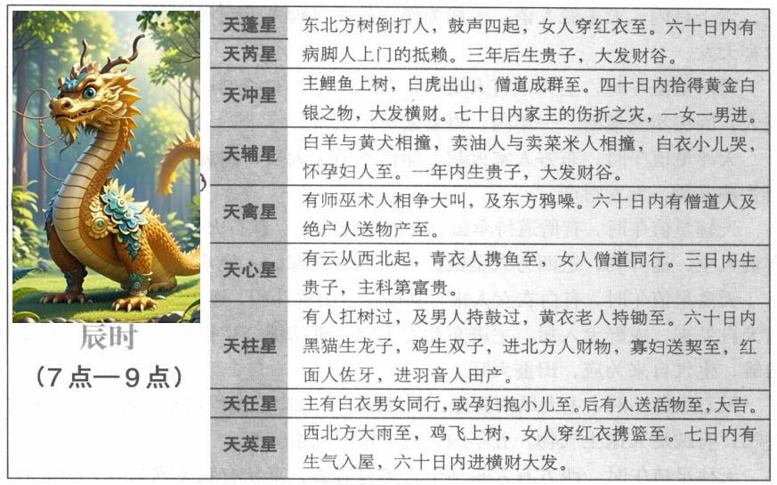 九星值辰时克应 天蓬星和天芮星值辰时,东北方树倒打人,鼓声四起,女人穿红衣至。葬造后,乌鸦四鸣绕屋,有劫贼至,破财。六十日内,有病脚人上门的抵赖。三年后,生贵子,大发财谷。 天冲星值辰时,主鲤鱼上树,白虎出山,僧道成群至。葬造后四十日内,拾得黄金白银之物,大发横财。七十日内,家主的伤折之灾,一女一男进。 天辅星值辰时,白羊与黄犬相撞,卖油人与卖菜米人相撞,白衣小儿哭,怀孕妇人至。葬造后一年内,生贵子,大发财谷。 天禽星值辰时,有师巫术人相争大叫,及东方鸦噪,葬造后六十日内,有僧道人及绝户人送物产至。 天心星值辰时,有云从西北起,青衣人携鱼至,女人僧道同行。葬造后,井中气如云出,三日内,生贵子,主科第富贵。 天柱星值辰时,有人扛树过,及男人持鼓过,黄衣老人持锄至。葬造后六十日,黑猫生龙子,鸡生双子,进北方人财物,寡妇送契至,红面人佐牙,进羽音 人田产。 天任星值辰时,主有白衣男女同行,或孕妇抱小儿为应。葬造后,有人送活物至,大吉。 天英星值辰时,西北方大雨至,鸡飞上树,女人穿红衣携篮至。葬造后七日内,有生气入屋,六十日内,进横财大发。 此信息最后更新时间为:2024-12-12 09:09 |