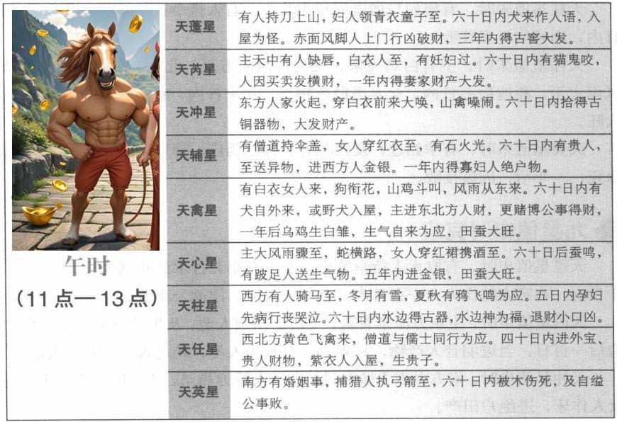 九星值午时克应 天蓬星值午时,有人持刀上山,妇人领青衣童子至。葬造后四十日内,家主亡。六十日内,犬来做人语,入屋为怪。赤面风脚人上门行凶破财,三年内,得古窖大发。 天芮星值午时,主天中有人缺唇,白衣人至,有妊妇过。六十日内,有猫鬼咬人,因买卖发横财,一年内,得妻家财产大发。 天冲星值午时,东方人家火起,穿白衣前来大唤,山禽噪闹。六十日内,拾得古铜器物,大发财产。 天辅星值午时,有僧道持伞盖,女人穿红衣至,有石火光。葬造后六十日内,有贵人至,送异物,进西方人金银。一年内,得寡妇人绝户物。 天禽星值午时,有白衣女人来,狗衔花,山鸡斗叫,风雨从东来。六十日内,有犬自外来,或野犬入屋,主进东北方人财,更赌博公事得财,一年后,乌鸡生白雏,生气自来为应,田蚕大旺。 天心星值午时,主大风雨骤至。蛇横路,女人穿红裙携酒至。葬造后六十日,蚕鸣,有跛足人送生气物。五年内,进金银,田蚕大旺。 天柱星植午时,西方有人骑马至,冬月有雪,夏秋有鸦飞鸣为应。葬造后五日内,孕妇先病行丧哭泣。六十日内,水边得古器,水边神为福,退财小口凶。 天任星值午时,西北方黄色飞禽来,僧道与儒士同行为应。葬造后四十日,进外宝、贵人财物,紫衣人入屋,生贵子。 天英星值午时,南方有婚姻事,捕猎人执弓箭至,葬造后六十日内,被木伤死,及自缢公事败。 此信息最后更新时间为:2024-12-12 09:09 |