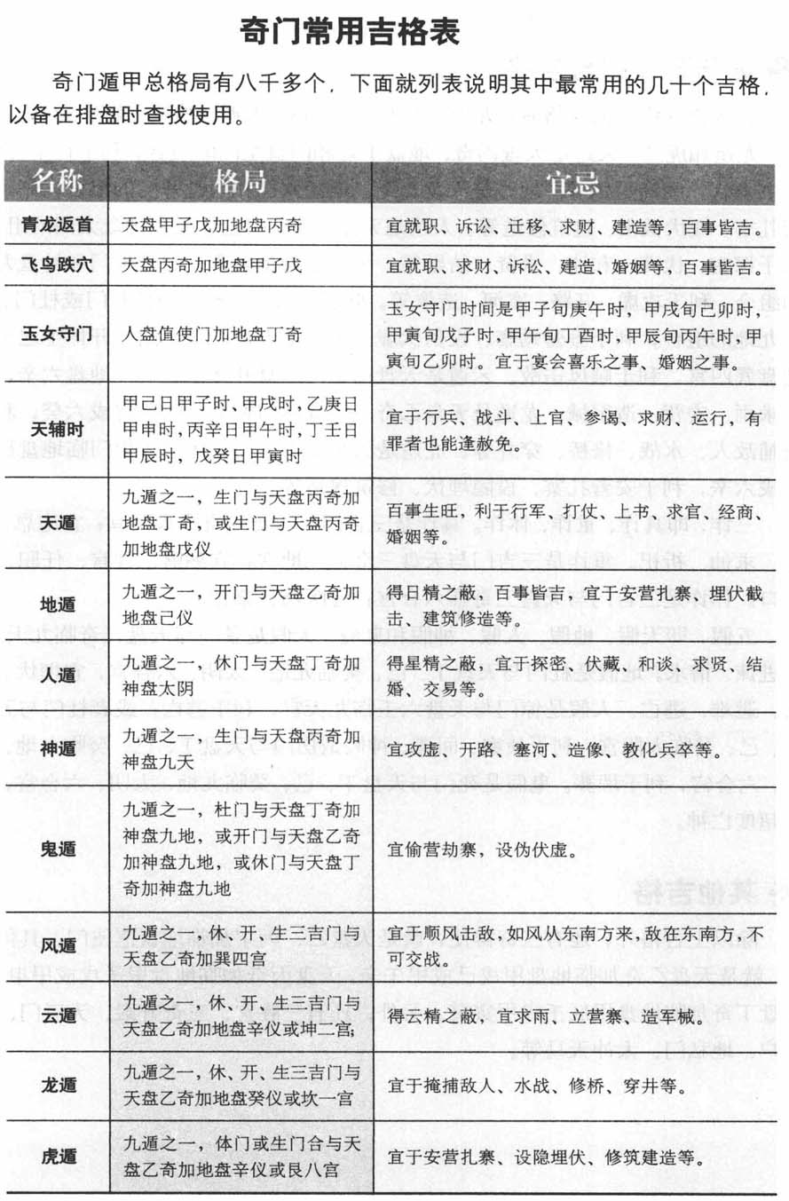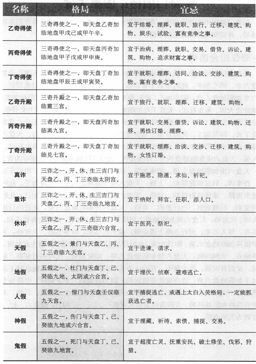 奇门格局概说 在奇门遁甲的时家奇门中,因为有九宫,阴遁和阳遁十八局,六十个时辰演一局,则总共就有9720种格局。但由于排宫时五宫无位,而寄于坤二宫,这样就只有八宫,所以实际上就有8640种格局。在这近万种的格局中,古人根据阴阳五行的生克原理和大量积累起来的吉凶应验经验,并进行分类、归纳和筛选,总结出一些吉格和凶格,供后人在具体的预测中加以参考。 一般来说,凡是遇到吉门、吉星和吉神配三奇就是吉格;反之,凡是遇到凶门、凶星和凶神就是凶格。星、门、宫、三奇、六仪之间,五行属性相生或比和的为吉格;反之,五行相刑、相冲、相克、相害和入墓的就是凶格。甲、乙、丙、丁、戊五阳干组合多为吉格;己、庚、辛、壬、癸五阴干组合多为凶格,特别是奇门遁甲中的甲为主帅,五行属木,最怕庚金克杀,所以遇庚多为凶格。 条奇仪组合吉格 天盘奇仪和地盘奇仪组合有以下几种吉格:青龙返首:天盘甲子戊加临地盘丙奇,即戊加丙。宜就职、诉讼、迁移、求财等,百事皆吉。但是,若是遇到门克宫或地盘为震三宫,则吉事变凶。飞鸟跌穴:天盘丙奇加临地盘甲子戊,即丙加戊。宜就职、求财、诉讼、婚姻等,百事吉。奇仪相合:乙庚、丙辛、丁壬为奇合,戊癸、甲己为仪合,得吉门,凡事有和之象,主和解、了结、平局、平分。 时间组合吉格 由时间决定的吉格有:天辅时:甲己日甲子时、甲戌时,乙庚日甲申时,丙辛日甲午时,丁壬日甲辰时,戊癸日甲寅时。虽然此时为伏吟凶格,但不为凶,反为吉。这些时辰宜行兵、战斗、上官、参谒、求财、运行,有罪者也能逢赦免。玉女守门:即门盘值使门所落之宫正遇地盘丁奇。具体时间是甲子旬庚午时,甲戌旬己卯时,甲寅旬戊子时,甲午旬丁酉时,甲辰旬丙午时,甲寅旬乙卯时。遇玉女守门,其方利于宴会等吉乐之事和婚姻之事。总之遇到天辅时就能逢凶化吉,遇到玉女守门的时辰,则定有喜事。 盘与奇仪组合吉格 盘与奇仪组合的吉格有:九遁,即天遁、地遁、人遁、神遁、鬼遁、风遁、云遁、龙遁和虎遁。天遁是天盘丙奇、地盘丁奇和门盘生门的组合,利于行军打仗、上书求官、经商婚姻等。地遁是天盘乙奇、地盘六己和门盘开门的组合,利于安营扎寨、埋伏截击、建筑修造等。人遁是天盘丁奇、门盘休门和神盘太阴的组合,利于探密、伏藏、和谈、求贤、结婚等。神盘是天盘丙奇、门盘生门和神盘九天的组合,利于攻虚、开路、塞河、造像等。鬼遁是天盘丁奇、门盘开门或杜门、神盘九地的组合,利于偷营劫寨、设伪伏虚。风遁是天盘乙奇、门盘开休生之一临地盘巽四宫,利于顺风击敌。云遁是天盘乙奇、六盘开休生之一、地盘六辛,利于求雨、安营、造军械。龙遁是天盘乙奇、门盘休门临地盘坎一宫或六癸,利于掩捕敌人、水战、修桥、穿井等。虎遁是天盘乙奇、门盘休门或生门临地盘艮八宫或六辛,利于安营扎寨、设隐埋伏、修筑建造等。 三诈,即真诈、重诈、休诈。真诈是三吉门与天盘三奇临太阴宫;宜施恩、隐遁、求仙、祈祀。重诈是三吉门与天盘三奇临九地宫;宜纳财、拜官、任职、添人口。休诈是三吉门与天盘三奇临六合宫;宜医药、祭祀。 五假,即天假、地假、人假、神假和鬼假。天假是景门与天盘三奇临九天宫,宜进谏、请求。地假是杜门与天盘丁、己、癸临九地、太阴、六合宫,宜埋伏、侦察、避难、逃亡。人假是惊门与天盘六壬临九天宫,利于逃亡;或者杜门与天盘丁、己、癸临太阴宫,利于侦察、间谍。神假是伤门与天盘丁、己、癸临九地、太阴、六合宫,利于埋葬。鬼假是死门与天盘丁、己、癸临九地、太阴、六合宫,利于超度亡神。 其他吉格 除以上吉格外,还有三奇得使,就是天盘乙、丙丁加临地盘值使门,具体而言,就是天盘乙奇加临地盘甲戌己或甲午辛,天盘丙奇加临地盘甲子戊或甲申庚,天盘丁奇加临地盘甲辰壬或甲寅癸。另外,还有三胜宫、三奇升殿、天三门、地四户、地私门、太冲天马等。 |