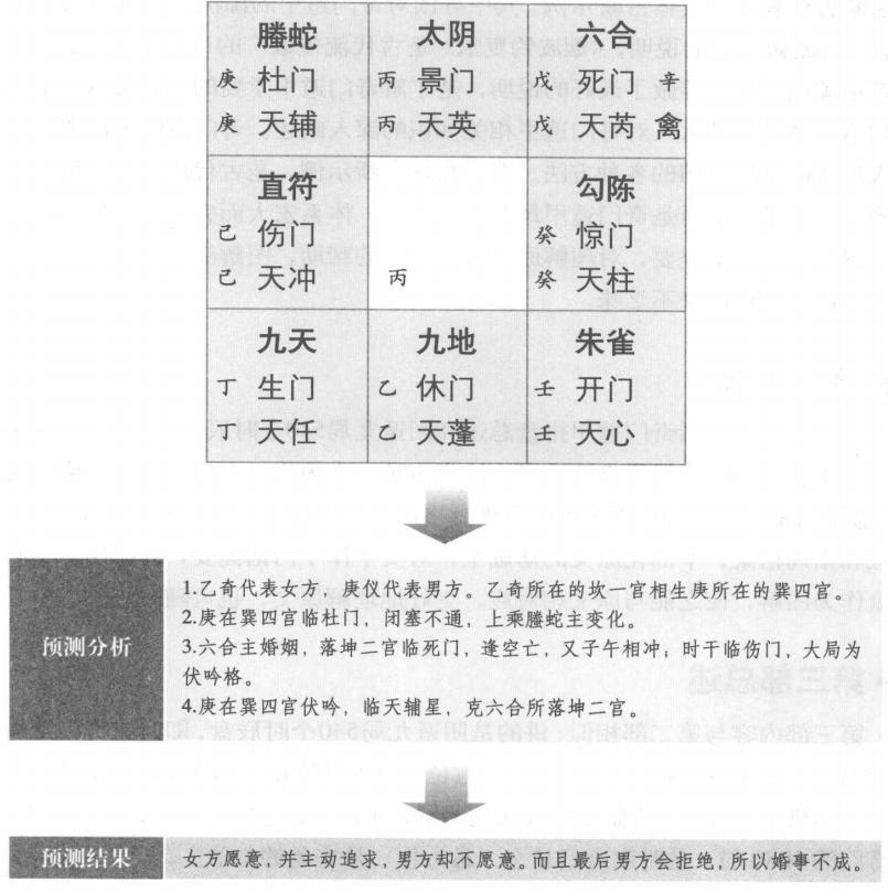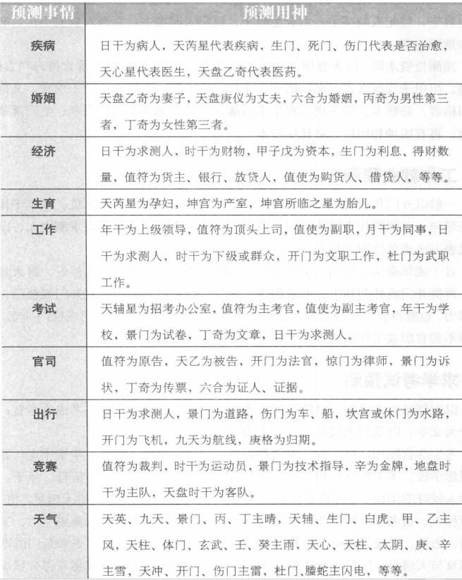 占法概说 奇门占法是奇门遁甲中较高层面的理论,也是较为广泛与复杂的理论,所以很难掌握。一方面是由于奇门遁甲自古被视为帝王之学,秘而不宣;另一方面,由于是秘传,所以各家说法不一,造成了应用种类的不同。 奇门遁甲不只是兵家用来行兵、布阵、掌握攻敌制胜之先机,而且更用于日常生活之上,可以如六爻占筮般地预测日常诸事之性状、动向,以及和其他事物的关系。基于奇门占法可应用于各类事物之上,综合各家观点,主要有以下一般依据:一是应用三奇六仪的特性、形态。二是九星特性、形状与五行。三是八门之五行与特性。四是八神之特性和意象。五是应用诸吉凶格的意义与特性。 婚姻生育预测 奇门占法在具体的预测中,有着具体的方法,下面就与现代日常生活中的许多事情,结合奇门遁甲,说明其预测的具体方法。 预测婚姻吉凶:以天盘庚仪为男方,天盘乙奇为女方,神盘六合为媒人。如果两者落宫五行相生比和,又逢吉门吉格,则恋爱可成,婚姻美满。如果两者落宫五行相冲相克,则婚事难成,或夫妻关系不好。还有以丁奇为第三者的女人,以丙奇为第三者的男人。 预测生育吉凶:天芮星为产母,以坤二宫为产室,坤二宫天盘所临之星为胎儿。若天芮星克天盘所临之星,主产速;若天盘星生地盘星天芮,主产迟;若天盘星克地盘天芮,主母凶;若地盘天芮克天盘星,主子亡;若时干临天盘星落地盘墓,主子死母腹内;若天地两盘乘凶门凶格,子母俱凶。 预测胎儿性别:以坤二宫天芮星为母亲,以天盘临坤宫之星为胎儿,阳星为男,阴星为女。其中天禽星临坤宫为双生,阳干为男,阴干为女。又以坤宫所临之门为胎儿,阳门为男,阴门为女。又以日干为母,时干为子,以时干阴阳和所临星、门、宫来判断男女。还有以值符为产母,以六合或值使为胎儿来取用神的。 预测产期:通常以坤宫对冲之宫天盘所临之干为应期,也可按阴日看庚上之干,阳日看庚下之干等其他断应期的方法进行。 奇门常用预测用神表 在奇门遁甲决策中,主要是根据九星、八门、八神和奇仪所代表的意象来决定用什么来预测,也就是用神。下面就列表说明现代生活中常见预测的用神。 经营求财预测 预测交易求财:以日干为买主,时干为卖主,六合为经纪人、中介人。日干生时干利卖方;时干生日干利买方;日干克时干,买主不要;时干克日干,卖主不卖;日干与时干比和,公平交易,主成交;日干和时干有一空亡,交易不成。六合生日干,经纪人向买主;六合生时干,经纪人向卖主;六合入墓或空亡,必有奸诈欺瞒之事。 预测投资求财:以天盘甲子戊为资本,以生门为利息。生门落宫得奇和吉格、吉星,生甲子戊落宫吉,必获倍利;比和,得中利。生门宫克甲子戊宫,又得凶神凶格者,必赔本。甲子戊落宫生生门落宫,主添加资本仍可获利。生门落墓绝之地,再有凶神和凶格,必耗尽资本。 工作就业预测 一般以开门代表文职工作及单位,以杜门代表武职工作及单位。以年干代表上级领导,以值符代表顶头上司,以月干代表同事,以日干代表求测之人,以时干代表下级或单位职工群众。 日干或年命落宫旺相,又得吉门、吉格或吉神,表示自身条件好,得天时地利;再得开门或杜门相生,则求职得官顺利;如果日干或年命克开门或杜门,经过努力,也能得到工作或官职;如果自身不得天时地利,又受开门或杜门冲克,必然得不到官职或工作。能否晋升职务、职称也是如此。 求学考试预测 以天辅星为考试院,以值符为主考或监考官,以值使为副主考或监考官;以丁奇为文章,以景门为试卷,以年干为录取学校。 考生落宫旺相,得三奇、吉门和吉格,又得天辅星、值符、年干相生,能考入理想学校。考生落宫旺相,得三奇、吉门和吉格,克天辅星、值符、年干,也能考入较好的学校。考生落宫休囚无力,又不得奇门、吉格,但得天辅星、值符、年干相生,虽考试成绩不佳,但也能录取。如果考生落宫死绝入墓或空亡,又得凶门、凶格,又受天辅星、值符、年干相克,必然考不上。以丁奇和景门的落宫状态及与天辅星、值符和年干的生克关系,来判断考试答题的优劣及得分状况。 人体疾病预测 预测疾病部位:以天芮星代表疾病,天芮星落离九宫,体表为头部、眼部、面部,体内为心脏、心血管、脑血管;落坤二宫,体表为右耳、右臂、右手、人体肌肤,体内为脾胃、食道、胰脏等消化系统;落巽四宫,体表为左耳、左臂、头发,体内为肝胆、血管、经络、气血等;落震三宫,体表为左肋、左腰,体内为肝胆、左肺;落兑七宫,体表为右肋、右腰、口舌、牙齿,体内为肺部、气管、右肺等;落艮八宫,体表为左腿、左脚、鼻子,体内为肠胃消化等系统;落乾六宫,体表为右腿、右脚、头部,体内为脊髓、筋骨、大肠;落坎一宫,体表为男女外阴部,体内为肾脏、膀胱、内分泌系统。 预测疾病吉凶:以天芮为用神,代表病人。天芮在生门者生,在死门者死。在乾、兑二宫,为气旺不能治;在离宫,为缠绵病榻;在震、巽二宫,为不药而治;在坎宫,病虽缠绵仍可治。 官司诉讼预测 一般以值符为原告,以天乙为被告,以开门为法官,以六合为证人证据,以景门为诉状,以丁奇为传票,以惊门为律师。值符落宫旺相有气,又乘吉门、吉星、吉格克天乙落宫,原告胜,反之,则被告胜。如果二宫比和,则可能合解。如果值符宫生天乙宫,可能原告主动求和;如果天乙宫生值符宫,则可能被告主动求和。 开门落宫