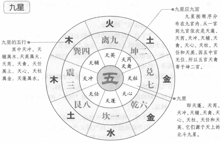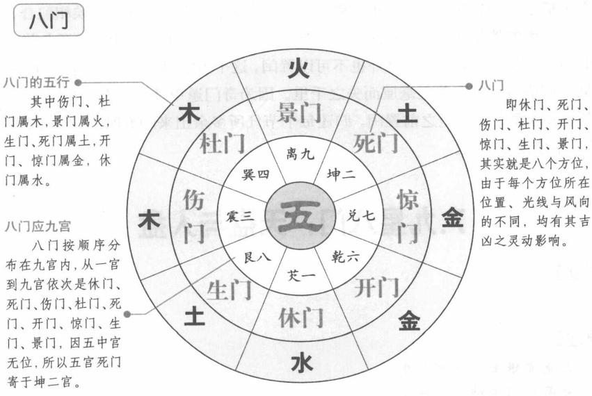八门九星概说 在奇门遁甲的九宫八卦中分别对应着九星和八门,它们是奇门遁甲最基础的概念,是奇门预测的根本性代表。奇门遁甲中的天盘九星:吉星是:天蓬星、天芮星、天柱星、天英星。吉星是:天辅星、天禽星、天心星、天任星、天冲星。 【原文】 认取九宫为九星, 【原注】 天蓬贪狼主坎一宫属水。 天芮巨门主坤二宫属土。 天冲禄存主震三宫属木。 天辅文曲主巽四宫属木。 天禽廉贞主五中宫属土。 天心武曲主乾六宫属金。 天柱破军主兑七宫属金。 天任左辅主艮八宫属土。 天英右弼主离九宫属火。 【白话提要】 奇门遁甲中的九星是指天蓬、天芮、天冲、天辅、天禽、天心、天柱、天任、天英。每颗星在九宫中分别主一个宫,天蓬主坎一宫,天芮主坤二宫,天冲主震三宫,天辅主巽四宫,天禽主中五宫寄坤二宫,天心主乾六宫,天柱主兑七宫,天任主艮八宫,天英主离九宫。每颗星的五行属性与所主宫相应:天蓬属水,天芮属土,天冲属木,天辅属木,天禽属土,天心属金,天柱属金,天任属土,天英属火。 【原文】 八门又逐九宫行。 【原注】 九宫配八门永定例:坎宫蓬星休门,艮宫任星生门。震宫冲星伤门,巽宫辅星杜门。坤宫芮星死门,附中宫禽星坤。离宫英星景门,兑宫柱星惊门,乾宫心星开门。 【白话提要】 八门配九宫为:休门坎一宫,死门坤二宫,伤门震三宫,杜门巽四宫,死门中五宫寄在坤二宫。开门乾六宫,惊门兑七宫,生门艮八宫,景门离九宫。还有一首歌诀,可帮助记忆这九星、八门在九宫的原定位置: 坎居一位是蓬休,芮死坤宫第二流。 更有冲伤并辅杜,震三巽四总为头。 禽星死五开心六,惊柱常从七兑游。 更有生任居艮八,九寻英景问离求。 |