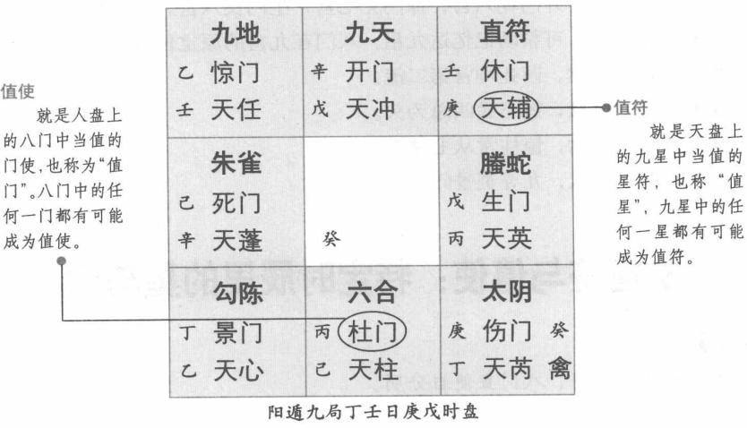 【白话提要】直符和直使也写作“值符”和“值使”。值符就是特定时辰里相应宫中的星值使就是特定时辰里相应宫中的门。值符和值使都和六甲是相联系的。找寻某特定时辰的值符,是通过六甲旬头进行的。以阳遁一局为例寻值符,以甲子为头的十个时辰(甲子、乙丑、丙寅、丁卯、戊辰、己巳、庚午、辛未、壬申、酉)属坎一宫,天蓬主坎一宫,所以这十个时辰的值符,都是天蓬。以甲戌为头的十个时辰(甲戌、乙亥、丙子、丁丑、戊寅、己卯、庚辰、辛巳、壬午、癸未属坤二宫,天芮主坤二宫,所以这十个时辰的值符都是天芮。以甲申、甲午、辰、甲寅为旬头的各时辰,值符依此推寻。 值符与值使 在奇门遁甲中,值符和值使是两个非常重要的概念,就是天盘上的九星和人盘上的八门中哪个在值班,哪个就是值符和值使。 以阴遁九局为例寻值使,以甲子为旬头的十个时辰属离九宫,离九宫为景门,所以阴遁九局甲子、乙丑、丙寅、丁卯、戊辰、己巳、庚午、辛未、壬申、癸酉十个时辰以景门为值使。以甲戌为旬头的十个时辰属艮八宫,艮八宫为生门,所以甲戌、乙亥、丙子、丁丑、戊寅、己卯、庚辰、卒巳、壬午、癸未十个时辰都以生门为值使。以甲申、甲午、甲辰、甲寅为旬头的各时辰,值使可依此推寻。 此信息最后更新时间为:2022-11-5 00:00