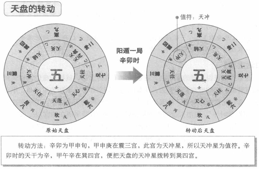 【原文】 值使逆顺遁宫去。 【原注】 八门休、生、伤、杜、景、死、惊、开,为值使也。原天盘上休在坎,生在艮,伤在震,乃三宫之定位也。假如冬至上元阳一局,图内乙庚日申时,就以伤门为值使,乃时干甲申居三官也。阳遁顺飞,阴遁逆飞,故云“值使逆顺遁宫去”。 【白话提要】 这里主要是说门盘的拨转法,在六十甲子表上从正时的旬头数起,数到正时其数为几,便从旬头(也是值符)所在之宫按照阳遁顺次、阴遁逆次的原则数起,飞数到数满,所落之宫就是值使应该加临之宫。比如阳遁一局辛卯时,辛卯旬头为甲申,甲申在震三宫。从甲申数到辛卯,其数为八。便从震三宫算起,顺飞八个宫:三、四、五、六、七、八、九、一,值使应加临坎一宫。旬头在震三宫,伤门为值使,就将伤门拨转到坎一宫。又如时辰同样为辛卯,但却为阴遁九局,旬头甲申在兑七宫,惊门为值使。便将惊门逆飞八个宫:七、六、五、四、三、二、一、九,即惊门加于离九宫。 天盘和人盘的转动 奇门遁甲确定局数和值符.值使后,还要根据所测的时辰转动天盘和人盘,下面就举例来说明。 |