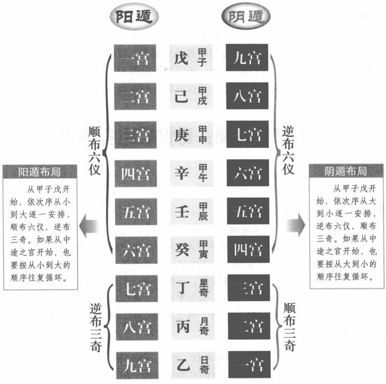 【原文】 阳遁顺仪奇逆布,阴遁逆仪奇顺行。 【原注】 冬至后十二节,惟用阳遁顺布六仪,逆布三奇,星符亦随时干行。假如冬至阳一局,图内坎上起甲子戊,坤上甲戌已,震上甲申庚,巽上甲午辛,五中宫甲辰壬,乾上甲寅癸,兑上丁奇,艮上丙奇,离上乙奇,乃仪顺去奇逆行也。夏至后十二节,惟用阴遁逆布,六仪顺布,三奇星符亦随时干行。假如夏至阴九局,图内离九宫起甲子戊,艮上甲戌已,兑上甲申庚,乾上甲午辛,五中宫甲辰壬,巽上甲寅癸,震上丁奇,坤上丙奇,坎上乙奇,乃仪逆奇顺行也。 【白话提要】 冬至后的十二节气用阳遁,顺布六仪,逆布三奇;夏至后的十二节气用阴遁,逆布六仪,顺布三奇。具体解释和举例可参见前面“阴阳二遁他顺逆”之句。 奇子的排布 由三奇和六仪组成的九颗奇子,在奇门遁甲的排布中有着不同的排布方法,按阴遁和阳遁而分为两种。 奇子布局的要点: 1、在奇门遁甲排盘时,奇子多用象牙或佳木制作。 2、奇门遁甲排盘时,奇子一式两副,一副放在天盘,一副放在地盘。 3、每副奇子共9枚,两副共18枚。 4、每个奇子可翻使用,正面写黑字,背面写红字。 5、奇子排布时,每当遇上值符时,要用背面的红字,以示区别。 |