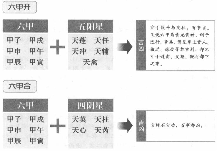 【原文】 六甲遇之非小补。 【原注】 《经》曰:“时加六甲,一开一合,上下交接。”又曰:“能知三甲,一开一合;不知三甲,六甲尽合。”六甲者,甲子、甲戌、甲申、甲午、甲辰、甲寅也。阳星加时为开。阳星:天蓬、天任、天冲、天辅、天禽。阴星加时为合。阴星:天英、天芮、天柱、天心。六甲之时,合时百事凶,开时宜战斗,往来百事吉。又曰:“甲为青龙,利以远行。将兵客胜,闻忧无,闻喜有。宜谒尊上,见贵人有喜。移徙、嫁娶百事吉。不可行遣怒及鞭杖事。”假如阳遁九局,甲已之日,黄昏得天任阳星,加时为开,百事吉。若无奇门,合得此局,亦得次吉,乃小补云。 【白话提要】 在奇门遁甲的布局演局时,六甲还有一开一合、上下交接的现象,当天蓬、天任、天冲、天辅、天禽这五个“阳星”加临之时,叫做“开”,当天英、天柱、天心、天芮这四个“阴星”加临之时,叫做合,据说这六甲的时间遇上“合”的时候,宜静不宜动,百事都凶,遇“开”则宜于战斗与交往,百事吉。又说六甲为青龙贵神,利于远行、带兵、谒见尊上贵人、搬迁、嫁娶等都吉利,却不可干谴责、发怒、鞭打部下之事。比如阳遁第九局,甲己日,黄昏时,得天任阳星加临,为遁甲开,百事吉利,如果没得到奇门之利,只得到这个局势,也可算是次吉,有小的补益。 六甲开合的吉凶 奇门遁甲局中的六甲与天盘上的九星相遇时,就会出现一开一合的现象,由于九星吉凶的不同,六甲开合的吉凶也不同。 |