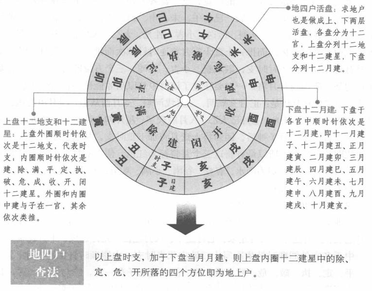 【原文】 若作阴私和合事,请君但向此中推。 【原注】 四户以月建加本时,却随除危定,开在何处,即是地四户。若与天三门同宫,尤吉。 《入式歌》云:天乙会合女阴私。所谓天乙会合,和阴私之事。要在三奇临六仪,与三奇吉门,合太阴太冲从魁小吉,加地四户,是谓福食,远行出入皆吉。地四户者,除定危开也。 假如正月建寅,卯上除,午上定,酉上危,子上开,更得三奇临之大吉。二月则从卯上起建也,凡阴谋事,用太阴太冲小吉,从魁加地四户而去,解见下文。 【白话提要】 从文字上看,这两句好像是说的玉女守门之用,但从前人的注释和引文中知道,这两句和下文相联系,是说的天三门、地四户之用,所以这两句是和下文倒装的句子。天三门、地四户之格可进行推测阴私和合之事。 【原文】 天三门兮地四户,问君此法如何处? 太冲小吉与从魁,此是天门私出路。 地户除危定与开,举事皆从此中去。 【原注】 天门有三,乃从魁、小吉、太冲三位也。起法以月将加本时,即寻从魁、小吉、太冲三位,为天三门也。起月将法,以授时历看,审订太阳过宫,方可选用。如去年十二月大寒节,某日时刻日躔元枵之次,太阳在子,以神后出将加用时。世俗但知登明为正月将,却不知登明是亥,犹待雨水节后,某日时刻,日躔鲰訾之次,太阳方过亥宫,以登明天月将方可用。 【白话提要】 这里是指要从月建之类的角度来分析考虑,判断吉凶。天三门是指从魁、小吉、太冲这三个位置。天三门的起法,是用“月将”加本时再寻找从魁、小吉、太冲这三个方位。起月法要查看时历,观察太阳过宫以后,才可以选用。例如登明是“正月将”,但却要到雨水节后某天的时刻太阳才过宫,这时才能起用。地四户是以月建加时支即用事时的地支,来寻找除、危、定、开的位置,如果能与天三门同在一宫则尤其吉利。 求天三门之法是做成两层的活盘,上下盘各分为十二宫。下盘各宫分别写十二地支:子、丑、寅、卯、辰、巳、午、未、申、酉、戌、亥。上盘各宫分别写十二月将:登明、河魁、从魁、传送、小吉、胜光、太乙、天罡、太冲、功曹。下盘十二地支顺时针依次而排;上盘十二月将逆时针依次而排。求天门时,以上盘当月月将,加下盘正时时支,则从魁、小吉、太冲、三个方位即为天三门。需要注意的是,所谓当月月将,一定要在过了该月中气以后才能使用;否则便用上月月将;十二个月月将是:正月亥登明、二月戌河魁、三月酉从魁、四月申传送、五月未小吉、六月午胜光、七月巳太乙、八月辰天罡、九月卯大冲、十月寅功曹、十一月丑大吉、十二月子神后。因为将上盘月将加下盘时支,从魁、小吉、太冲三个方位即为天三门,所以最好将这三个月将标为红色,使之醒目。十二个月的中气从正月到十二月分别为雨水、春分、谷雨、小满、夏至、大暑、处暑、秋分、霜降、小雪、冬至、大寒。 求地四户也是作成两层活盘,上下各分为十二宫,下盘于各宫中顺时针依次写十二地支为月建:十一月建子、十二月建丑、正月建寅、二月建卯、三月建辰、四月建巳、五月建午、六月建未、七月建申、八月建酉、九月建戌、十月建亥。在上盘中于各宫外圈顺时针依次写十二地支代表时支;内圈顺时针依次写建、除、满、平、定、执、破、危、收、成、开、闭。建与子在一宫,除与丑在一宫,其余依次而推。求地四户时以上盘时支,加于下盘当月月建,则上盘除、定、危、开所落的四个方位即为地四户。为了醒目,除、定、危、开可特别标出。 天三门的查法 天三门是用十二月将和时辰的地支来择吉,如果遇到十二月将中的从魁、小吉、太冲三个方位,就是天三门。 注意事项:当月月将一定要在过了该月中气以后才能使用,否则便用上月月将。十二个月的中气从正月到十二月分别是雨水、春分、谷雨、小满、夏至、处暑、秋分、霜降、小雪、冬至、大寒。 地四户的查法 地四户是用十二地支、十二建星、十二月建来择吉,如果遇到十二建星中的除、定、危、开四个方位,就是地四户。 |