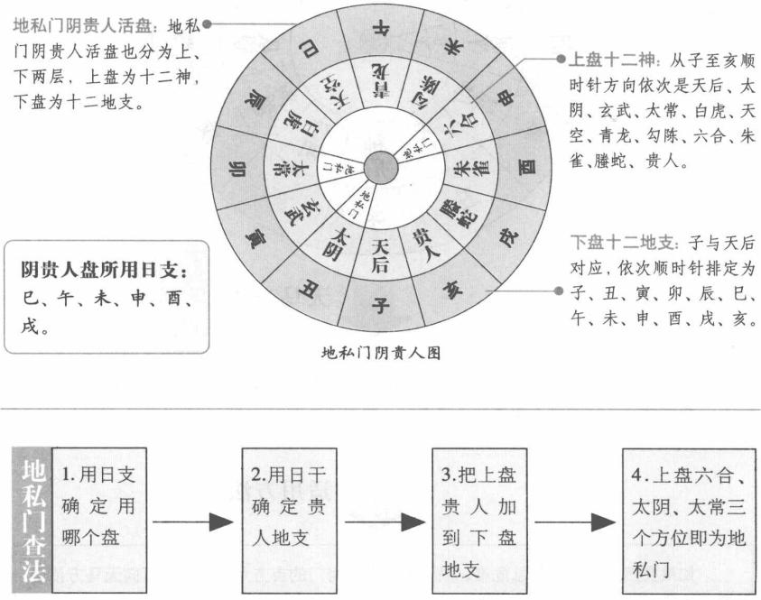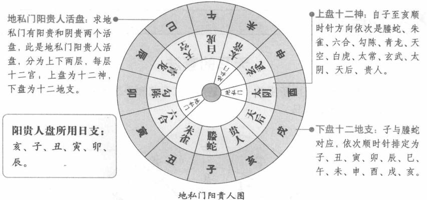 【原文】 六合太阴太常君,三辰元是地私门。 更得奇门相照耀,出门百事总欣饮。 【原注】 阳时利击,阴时宜陕,阳先举,阴后交。凡欲击者,为破而击之。陕者,密而去之。其败军宜向六合下走得出也。 假如以六合、太阴、太常为三辰,依图推之,看在何方。日支自亥至辰为阳,用阳贵人,阳贵人用上一字;自巳至戌为阴,用阴贵人,阴贵人用下一字。 假如丁亥日,亥为阳日,丙丁猪鸡位,则亥猪为阳日贵人,须用贵人加亥上,顺数去,却看六合、太阴在何处,即是地私门。此只论日,不论时,然须得奇门,方可用。一例审太阳过宫,以月将加用时,顺寻本日贵人,起星求地私门。 寻找“贵人” 因为地私门和贵人相联系,所以要了解地私门就必须先了解贵人,贵人由日干决定,主要分为阴贵人和阳贵人两类,下面就介绍其寻找方法。 【白话提要】 相传在行军打仗之时,在属阳的时间里利于出击破敌,在属阴的时间里适宜撤退逃避。战败者可以从六合的方向秘密出逃。六合、太阴、太常这三辰叫做地私门,它与“贵人”相关联,“贵人”是由日干决定的,分为阳贵人和阴贵人。所以要先了解“贵人”,然后才能谈地私门。 《阳贵人歌》中说:“庚戊见牛甲在羊,乙猴己鼠丙鸡方。丁猪癸蛇壬是兔,六辛逢虎贵为阳。”这就是说庚、戊日丑为阳贵人,甲日未为阳贵人,乙日申为阳贵人,己日子为阳贵人,丙日酉为阳贵人,丁日亥为阳贵人,癸日巳为阳贵人,壬日卯为阳贵人,辛日寅为阳贵人。《阴贵人歌》中说:“甲贵阴牛庚戊羊,乙阴在鼠己猴乡,丙猪丁鸡辛遇马,壬蛇癸兔属阴方。”这就是说甲日丑为阴贵人,庚、戊日未为阴贵人,乙日子为阴贵人,己日申为阴贵人,丙日亥为阴贵人,丁日酉为阴贵人,辛日午为阴贵人,壬日巳为阴贵人,癸日卯为阴贵人。 求地私门时,需要做成阳贵、阴贵两个活盘。日支为亥、子、丑、寅、卯、辰,用阳贵活盘;日支为巳、午、未、申、酉、戌,用阴贵活盘。阳贵活盘的上盘分十二宫,自子至亥顺时针方向依次写十二神:螣蛇、朱雀、六合、勾陈、青龙、天空、白虎、太常、玄武、太阴、天后、贵人。阴贵活盘上盘十二宫排十二神,次序与阳贵活盘相逆。自子至亥顺时针方向依次排列为:天后、太阴、玄武、太常、白虎、天空、青龙、勾陈、六合、朱雀、螣蛇、贵人。无论阴阳活盘,贵人都在亥位。阴阳贵活盘下盘十二宫顺时针方向排十二地支。求地私门时,先审看日支,看用阴贵人还是用阳贵人,日支为亥至辰用阳贵人,为巳至戌,用阴贵人。再审看日干,看贵人为哪个地支,然后把上盘的贵人加到下盘的这个地支上去,六合、太阴、太常三个方位即为地私门。例如丁亥日,日支为亥,用阳贵人;日干为丁,丁阳贵为亥,即用阳贵活盘,将上盘贵人加到下盘亥上,六合在寅,太阴在酉,太常在未,寅、未、酉三方即为地私门。又如辛丑时日支为丑用阳贵人,日干为辛,辛阳贵人为寅,即用阳贵活盘,将上盘贵人加到下盘寅上,六合、太阴、太常分别为巳、子、戌,则巳、子、戌三方位为地私门。阴贵人的例子如乙未时乙阴贵为子,以阴贵活盘上盘贵人加于下盘子上,太阴为寅,太常为辰,六合为酉,则寅、辰、酉三方位即为地私门,如得奇门即可用。 地私门查法 地私门是用十二地支和十二地支神来择吉,如果遇到太阴、太常、六合三个方位即为地私门。 |