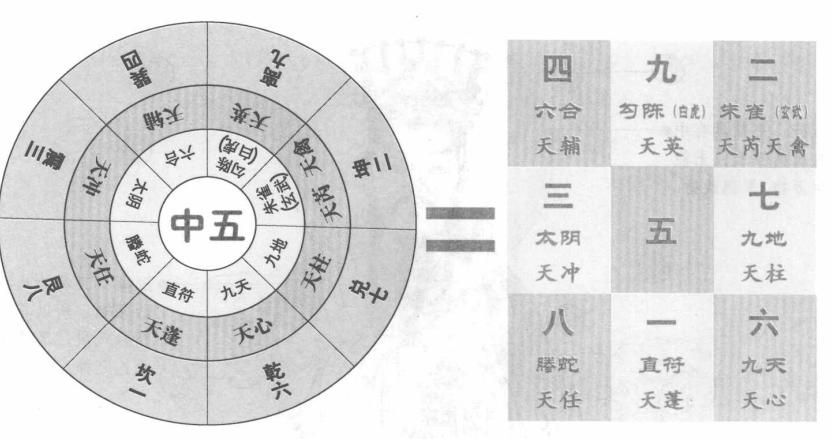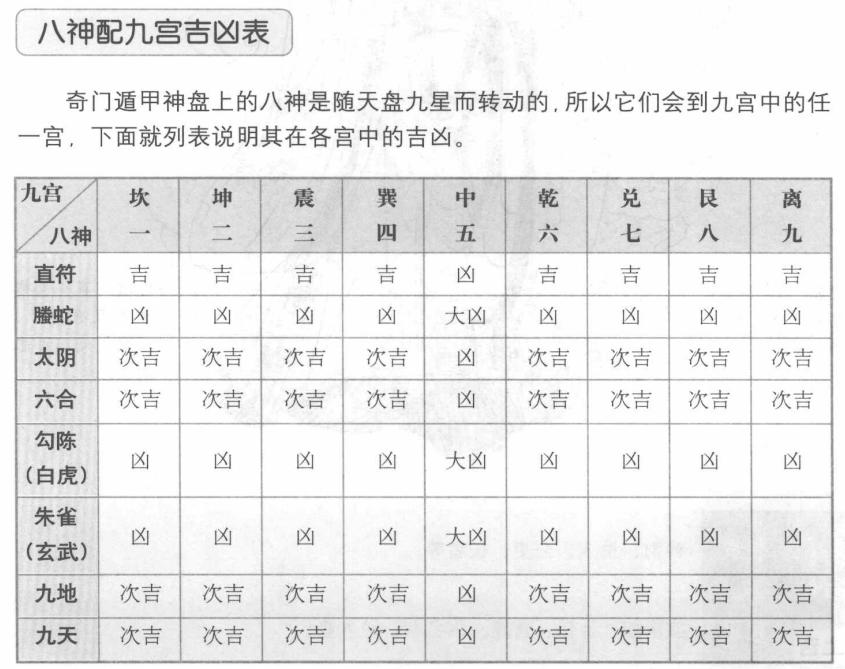八神概说 在奇门遁甲的神盘上分列有八神,又称八将,就如纳甲筮法的六神和四柱命理中的神煞。奇门遁甲中的八神,是古人在天人感应中发现的与九宫八卦具有对应性质的八神神秘力量,在具体的预测中有很大的参考作用,也可称之为用神。奇门八神由阴遁和阳遁分为两种,阳遁八神有直符、螣蛇、太阴、六合、勾陈、朱雀、九地、九天。阴遁八神有直符、螣蛇、太阴、六合、白虎、玄武、九地、九天。 八神详解 直符因与地盘值班六甲大将和天盘值班之星相对应,所以称为直符。它具有中央土的性质,是八神的领袖。它所到之处、百恶消散,所以古人又称其为天乙之神。 腾蛇具有南方火的性质,为虚诈之神。它性格虚伪,口舌毒辣,专管惊恐怪异、虚诈不实之事。 太阴具有西方阴金性质,为荫护之神。它性格阴匿暗昧,太阴所临之方,可以密谋策划、避难藏兵。 六合具有东方木的性质,为护卫之神。它性格开朗平和,专管婚姻交易中介之事。六合所临之方,利于谈判、交易、婚姻嫁娶。 勾陈或白虎具有西方金的性质,为凶煞之神。它性格凶猛好斗,专管行兵打仗、凶杀打斗、疾病死伤、交通事故等。 玄武或朱雀具有北方水的性质,为奸谗小盗之神。它性格爱偷喜盗,专管盗贼、逃亡、口舌之事。 九地具有坤土的性质,有厚载之德,为万物之母,古人称其为坚牢之神。它性格柔顺安静,滋生万物。九地所临之方,利于屯兵固守,播种养殖。 九天具有乾金的性质,为天为父,古人称其为威悍之神。它性格刚强好动。九天所临之方,可以扬兵布阵,行军打仗,坐飞机旅行出国。 八神运行的规律是阳遁顺行,阴遁逆行,随天盘九星值符运行的叫天盘八神,随地盘六甲值符运行的叫地盘八神。在奇门遁甲的应用中,有的用天盘八神,有的用地盘八神,也有两者都用的,一盘只用天盘八神。 八神原始宫位 奇门遁甲中的八神分为阳遁和阴遁两种,它是由九星的原宫位定其原始宫位,也分为圆盘和方盘两种。 |