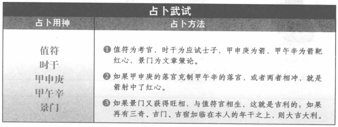 【原文】 占武试以值符为试官,时干为士子,甲申庚为箭,甲午辛为红心,景门为策论。专以甲申庚落官克甲午辛的官或相冲,为箭中红心。再看景门得旺相,又与值符相生者,利。再有三奇、吉门、吉宿加本人年干,大利。 【白话提要】 在占武试时,应该把值符当做考官,时干当做应试士子,甲申庚当做箭,甲午辛当做箭靶红心,景门当做文章策论。如果甲申庚的落宫克制甲午辛的落宫,或者两者相冲,这就是箭射中了红心。如果景门又获得旺相,与值符宫相生,这就是吉利的;如果再有三奇、吉门、吉宿加临在本人的年千之上,则大吉大利。 白话图解 占卜武试之法 此信息最后更新时间为:2017-11-4 00:00