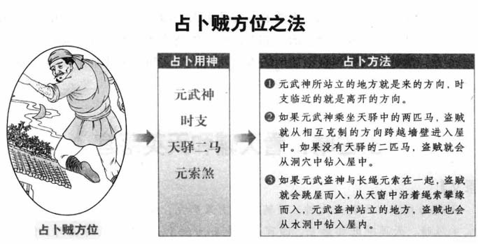 【原文】 视元武所立神为来方,支临为去方。元武,盗神。乘天驿二马,盗贼从克方逾垣越屋而入。若无天驿二马,必穿穴而入,元武盗神与长绳元索煞并者,其贼跳屋,从天窗中缘绳索而下,元武盗立地方,从水窦中而入。 【白话提要】 占卜盗贼的方位时,元武神所站立的地方就是来的方向,时支临近的就是离开的方向。元武就是偷盗之神。乘坐天驿中的两匹马,盗贼就从相互克制的方向跨越墙壁进入屋中。如果没有天驿的两匹马,盗贼就会从洞穴中钻入屋中。如果元武盗神与长绳元索在一起,盗贼就会跳屋而入,从天窗中沿着绳索攀缘而入,元武盗神站立的地方,盗贼也会从水洞中钻入屋内。 此信息最后更新时间为:2016-11-4 00:00