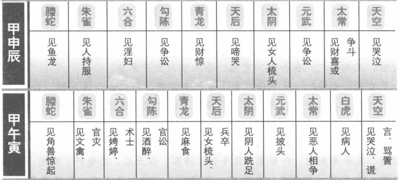【原文】 甲辰子,合贵人,出遇仆人解事,珍珠。合螣蛇、朱雀,见人溺水。合六合,见争竞。 合勾陈,见淫妇。合青龙,见财。合太阴,见妻妾垂帘。合元武,见人散发。 合太常,见布枷杻。合白虎,见猫。合天空,女子争竞。 甲寅戌,合螣蛇,见大讼。合朱雀,见公吏。合六合,见入狱。合勾陈,见斗讼。合青龙,见争财。合太阴,见婚嫁。合元武,遭囚。合太常,见印信。合 白虎,见火。合天空,见奴婢。 甲子申,合天乙,见遗金。合朱雀,见公吏口舌。合六合,见媒妁、术士。 合勾陈,见争竞失财。合青龙,见斗讼、诗客。合天后,闻生产、僧道。合元武,见盗贼。合太常,见开宴。合白虎,见穿井、斗讼。合天空,见孤寡哭泣。 甲戌午,合天乙,见执圭。合螣蛇,见妖鬼五色物。合朱雀,见官灾、飞鸟、驴。合六合,见媒妁。合勾陈,见公差。合青龙,见病人。合天后,见歌唱吟诗。 合太阴,见披发。合太常,见筵会。合天空,见执笏、驴。 甲申辰,合螣蛇,见鱼龙。合朱雀,见人持服。合六合,见淫妇。合勾陈,见争讼。合青龙,见财惊。合天后,见啼哭。合太阴,见女人梳头。合元武,见 争讼。合太常,见财喜或争斗。合天空,见哭泣。 甲午寅,合螣蛇,见角兽惊起。合朱雀,见文禽、官灾。合六合,见娉婷、术士。合勾陈,见酒醉、官讼。合青龙,见麻食。合天后,见女梳头、兵卒。合 太阴,见阴人跣足。合元武,见披头。合太常,见恶人相争。合白虎,见病人。 合天空,见哭泣、谎言、骂詈。 壬奇合应详解 所谓壬奇合应,是六壬与奇门遁甲相合而构成的应验,下面就详细解读其所应的事情。 【白话提要】 这里主要讲的是六甲和六壬的应验。比如六甲中的甲辰和六壬中的壬子,合贵人,会遇到仆人解事,珍珠。合螣蛇和朱雀,会遇到人溺水。合六合,会遇到争竞。合勾陈,会遇到淫妇。合青龙,会遇到财物。合太阴,会遇到妻妾垂帘。合玄武,会遇到人散发。合太常,会遇到布枷扭。合白虎,会遇到猫。合天空,会遇到女子争竞。 |