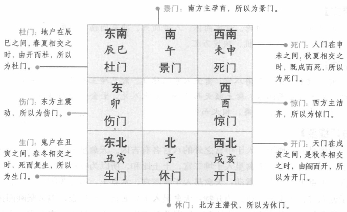 【原文】 隅开四门,阎辟相倚,生死相承。 【原注】 天门在成亥之间,秋冬相交之际,由阁而开。地户在辰已之间,春夏之交由开而杜。人门在申未之间,秋夏之交,既成而死。鬼户在丑寅之间,春冬之交死而复生。此八门之定位。 八门的由来 奇门遁甲中的八门中的名称,是根据四正和四隅方位而得到的,下面就详细说明。 【白话提要】 天门在戌亥之间,是秋冬相交之时,由阁而开,所以为开门;地户在辰巳之间春夏相交之时,由开而杜,所以为杜门,人门在申未之间,秋夏相交之时,既成而死,所以为死门;鬼户在丑寅之间,春冬相交之时,死而复生,所以为生门,这就是八门的定位。 |