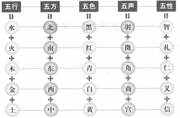 【原文】 镇于五方,列为五色,发为五声,酿为五性,通为五味,动为六情。 【原注】 北方阴炁所积,水居北;南方阳燕盛动,火居南;东方阳燕所生,木居东;西方阴炁所禁,金居西;中央吐纳万物,故土居中。 青居东,象木。赤居南,象火。白居西,象金。黑居北,象水。黄居中,象土。此五行正色也。从金生水而一白居坎,水还于地而二黑居坤,以水生木而三碧居东,木坏金炁而四绿居巽,五为天地之中,故土黄无变,从而生金,则得金之正色,而邻于水,从而受丁火,则受火之赤色而归兑,纳丙火,则受阴之凝结而归艮。水居北方,与南为对。离为阴火,积阴之著,映带于水,故其色为紫宫土,商金,角木,微火,羽水。即仁、义、礼、智、信。通于口者酸、苦、辛、咸、甘。喜、怒、哀、乐、爱、恶。 【白话提要】 五行应于五方,水居北方,火居南方,木居东方,金居西方,土居中。五行应于五色,青色居东为木,红色居南为火,白色居西为金,黑色居北为水,黄色居中为土。五行应于五声,宫为土,商为金,角为木,为火,羽为水。五行应于五性,仁为木,义为金,礼为火,智为水,信为土。五行应于五味,酸为木,苦为火,辛为金,咸为水,甘为土。五行应于六情,怒为木,喜为金,哀乐为土,爱为水,恶为火。 五行的物象 五行是一个高度抽象的概念,可以延伸出许多物象来,下面就五行与方位颜色、声音等的对应做一解说。 此信息最后更新时间为:2017-11-4 00:00