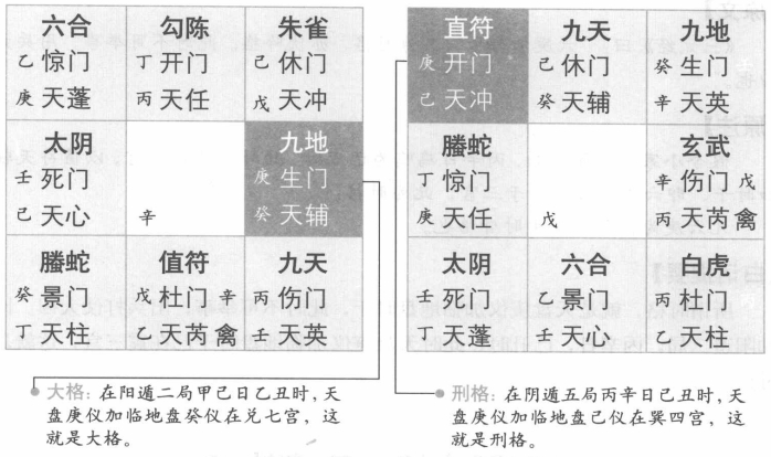 奇门遁甲中的大格和刑格都与庚仪有关,下面就分别举例来说明它们的格局构成。