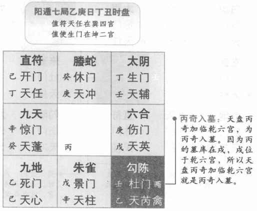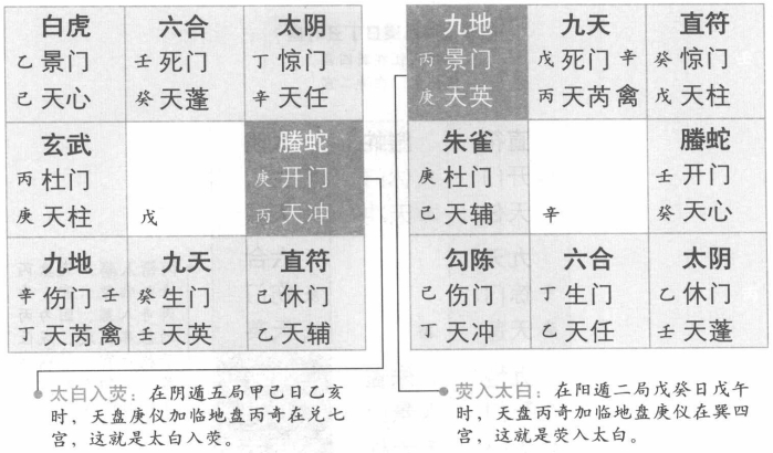 所谓太白入荧惑,就是天盘庚仪加临地盘丙奇,因为庚被称为太白,丙被称为荧惑,所以被称为太白入荧惑。此时如果与敌人斗争,必须提防有盗贼前来。比如阴遁三局,乙庚日,戊寅时,天盘庚仪加临地盘丙奇在坤二宫,这就是太白入荧惑。