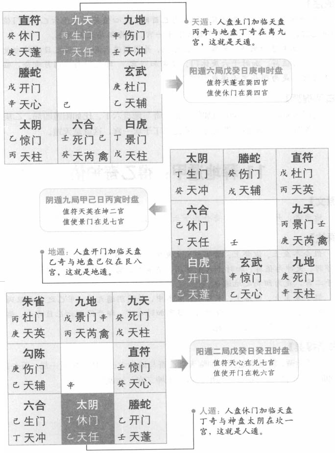 【原文】 地遁者,开门与六乙日奇合临于六已之上,为地遁。此时得日精之蔽。 【原注】 假令冬至上、惊蛰上、清明中、立夏中,并用阳一局,丙辛之日,日出时为辛卯时,天冲为值符,加时干六辛伤门,值事加二宫,即门与六乙日奇合,临六己于二宫,是为阳局之地遁也。 假令夏至上、白露上、寒露中、立冬中,并用阴遁九局,甲已之日平旦丙寅时,天英为值符,加时干六丙景门。值事加时七宫,即开门与六乙日奇合,临六已于八宫,是为阴局之地遁也。 【白话提要】 所谓地遁,就是人盘开门加临天盘乙奇与地盘六已。比如阳遁一局,丙辛日,辛卯时,开门加临天盘乙奇与地盘六已于坤二宫,这就是地遁。 三遁示例 奇门遁甲吉格中有三遁格局,三遁是指天遁、地遁和人遁,下面就分别用实例盘说明这三种格局的格式 |