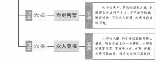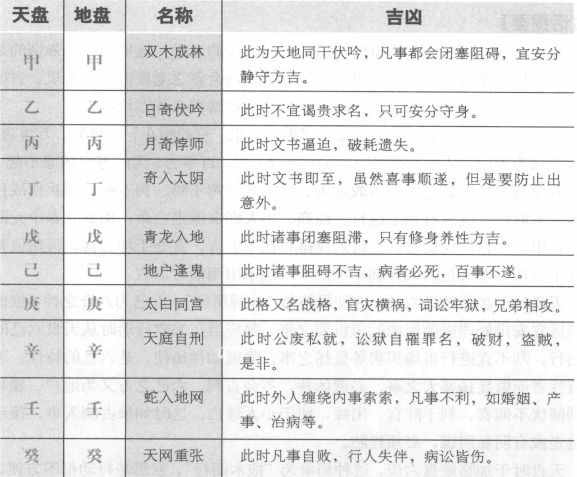 时千加六仪吉凶 在奇门遁甲的排盘过程中,天盘的时干加临地盘的六仪时各有吉凶,下面就-一加以说明。 【原文】 十干加伏若加错,入库休囚吉事危 【原注】时加六戊,乘龙万里,莫敢呵止。六戊为天门,又为天武,宜以远行万里,百事吉。戊为天门,凶恶不起,当从天上六戊出,挟入天门,故曰:“乘龙万里”凶恶不敢害,鸡不鸣,犬不吠,将兵客胜,闻忧无,闻喜有,利以远行、市贾小人惊走亡命。假令立春中元阳五局,甲己之日戊辰时,此时六戊在五宫寄坤二以值符加时干,即六戊临二宫出西南吉。 时加六已,如神所使,不知六已出被凶咎,已为六合,此时宜为阴谋秘密之事,当从天上六已出,不宜市贾,为显扬之事,隐匿如神所使,不知六已者,谓为显赫, 必逢休咎,又为地户,独出独入,无有见者,将兵闻喜无闻忧,有利以出官、嫁娶。小人利亡命惊走。若占人,有逃亡、阴私之事。 时加六庚,抱木而行;强有出者,必见斗争。谓庚为天狱,此时凶强,有出者,必遇刑罪。故曰:“能知六庚,不被五木;不知六庚,误使入狱。”或被凌辱,将兵主胜,不利客,利屯营固守。闻忧有,闻喜无。市贾道死,物伤无利,入官嫁娶凶。六庚之时,惟宜固守, 能知六庚之时,谓此时已下至六癸时,不宜出动。时加六辛,行遇死人;强有出者,罪罚缠身。此时行来出入并凶。强有出入,斧钻在前,行为在累。故曰:“能知六辛,所往行来;不知六辛,多被械。”又辛为天庭,罪网自缠,将兵主胜,不利客,可行刑,决罪人,不宜嫁娶,入官市贾、问疾。 时加六壬,为吏所禁;强出入者,飞祸将临。此时不可远行出入,百事凶,强出必有牢狱。壬为天牢,怨仇所稽,将兵主胜,利伏藏邀遮,不宜入官、移徙、 嫁娶、逃亡。病者,进退不死。时加六癸,众人莫视;不知六癸,出门见死。此时凶,不利,出入皆凶。宜隐遁求仙,亡命绝迹。当从天上六癸下,出入不见。故曰:“众人莫视”。又癸为天藏,利以伏匿、逃亡,将兵主胜。闻忧有,闻喜无。不宜出官、市贾、嫁娶移徙、入室凶,疾病者重,遗亡不得。 三奇嫌入,墓门嫌泊;墓官三位,有消停门。克下宫为障,时干克日干为损明。六仪受刑,天干日支神犯上,更忌支辰及伏吟,出兵发令恐紧急,加错三奇,入墓休囚,及犯十干伏吟等项,须吉返凶也。 十干伏吟格 在奇门遁甲中,如果天盘十干和地盘十干一样,这就是伏吟格,下面就介绍一下十干伏吟的格局,这种格局都为凶,所以此时不要从此方位出行。 【白话提要】 十千又称“时干”;库又称“墓”,是死废没的意思。这里的歌诀强调的是在布局与演局时千万不要将天干排错位置,否则就会差之毫厘而失之千里,吉凶也会反过来。下面以戊、己、庚、辛、壬、癸六种情况来加以论述。 天盘时干加临地盘六戊,局象为“乘龙万里,莫敢呵止”的格局,万事吉利。因为六戊为天门,又为天武方向,宜于远行万里,百事吉。天门方向凶恶不起,所以说乘龙万里,凶恶之事物不敢加害。据说此时鸡不鸣、狗不叫,领兵作战预示客体一方取胜。这时有利于远行、经商,小人则会惊走亡命。例如立春中元阳遁五局,甲、已日,戊辰时,这时六戊排布在中五宫,寄处于坤二宫,再用值符加 临时千六戊,即天盘六戊并临于坤二宫,预示出西南方向吉。天盘时干加临地盘六已,这种局势为“如神所使”。六已为六合之性,据说这时只适宜安排处理需要保密的或机要之事,并应当在采取行动时从天盘六已的方位出行,却不宜进行市场买卖等显扬之事。隐匿如神所使,是六已的特性。不知此特性者而做显扬盛大之事,必遭休咎,不会吉利。六已之方又为地户,领兵作战则闻忧不闻喜,利于辞官、出嫁,便于小人逃亡。这时如果占测人事,预示有人逃走或有阴私阴谋,必须提防。 天盘时干加临地盘六庚,这种局象为“抱木而行”,意思是行动很不方便,如果强行出动,容易遇见争斗的场面。因为庚为“天狱”,主凶,如果强行举动,易触犯刑法,获取罪名;如果不被刑处,也易遭受凌辱。这时带兵作战,利主体不利客方,有利于屯营固守。不利于强攻进击。市场买卖时则主示途中有事故出现不吉利,入公门、嫁娶等皆凶。总之,六庚之时只宜固守本位,不宜积极活动。天盘时干加临地盘六辛,这种局象为“行遇死人”,触犯霉头。据说如果此时强行出动,往往被罪罚缠身,这里不论行来的还是出去的皆凶。因为辛被称为“天庭罪网”,不宜主动缠入。领兵作战时,此时利主体不利客方,但可以行刑决斩罪犯,却不宜于嫁娶、入官、市贾等。 天盘时干加临地盘六壬,这种局象为“为吏所禁”。据说不宜远行、出人,百事皆凶且有牢狱之灾。因为壬被称为“天牢”,乃怨仇所积之地。此时带兵作战利于主方,宜于潜伏隐藏、遮迹设伏,不宜出入迁移,疾病可能延绵不愈。 天盘时干加临地盘六癸,这种局象为“众人莫视”。此时不利出入行动,宜于隐遁绝迹,如果选择天盘上六癸方位出去,则众人不见其踪。因为为“天藏”利于潜伏隐匿与逃亡撤退,领兵作战主体一方获胜。六癸时闻忧不闻喜,不宜于出官、市贾、迁移,疾病可能加重,遗失的东西不易找回。 乙、丙、丁三奇忌入墓宫,休、开、生三吉门也是如此,时干克日为“日月损光明”,“六仪击刑”是忌讳的格局,以及伏吟、反吟等局象,在出兵发令的紧急状态下,如果加错了,形成三奇入墓及休囚之宫,以及犯着十干伏吟等,就会 使吉变为凶。从上可知,古人在行军作战时特别注意避开凶时而