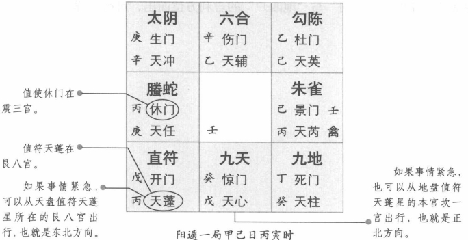 紧急与从容时择吉方法 在用奇门遁甲择吉时,当事情处于危难紧急时,没有选择三奇和吉门的时间,可以从值符天乙方位出行:而事情缓和从容时,即可选择三奇和吉门而行 【原文】 急则从神缓从门,三五反复天道亨 【原注】 《三元经》曰:谓有事不暇择时,并三奇吉门,当天乙所在宫,及值符之神宫而去,谓之从神,自然获吉,盖值符甲子,常从六戊,是为天门,事急,则从天上六戊下去,事缓,则可待时三奇吉门而去。 假令冬至阳遁一局,甲己之日丙寅时,此时天乙加六丙于八宫,值符在一宫 若有急事,可向东北天乙下,及正北值符六戊下去皆吉也。又曰:神谓如甲子蓬星日,丙寅时,甲子六仪头,以甲子天蓬星,休加地盘六丙上,即从奇下出去。如事急,欲出路,或在军阵,中门又不通,只寻吉神下去。事缓,可以就吉门,奇而往也。三者,三奇也。五星吉,英、任、冲、辅、心也。或门凶无奇,又无吉星,反伏无处吉,事又急迫,须向北斗下,默念三奇咒。云言不得三吉奇门,但从三奇所临方出,百事吉。所谓吉则从神也。”阴阳二遁有闭塞,八方皆无门可出,即依玉女法,凡甲子时、甲午时,在内利主,甲申时在门两损,甲辰、甲成,在外利客。 《符应经》:“若无奇门出,紧即依张良以筹加出天门地户而出也,吉利。” 【白话提要】 三元经上说,遇上有急事来不及选择时间及寻找乙、丙、丁三奇和开、休、生三吉门的方向时,可以按照天乙值符所在宫的方位或者值符本宫的方位行动或出走,这就是“急则从神”即跟从天乙贵神的方向行动,自然容易得到吉祥。因为值符六甲又称为天门,事急则从天上六甲方位行动出走,事缓则选择三奇与吉门的方向采取行动。 例如冬至上元阳遁一局,甲、已之日,丙寅时,这时值符天乙加临六丙于民八宫,值符本宫在坎一宫,如果遇到急事,就可以从东北方向天乙宫位出行,或者从正北方向值符本宫的坎与六戊的方位出行。 所谓“神”,如上例的甲子与天蓬星当值的丙寅时,甲子为六仪之首,用甲子,天蓬星及休门加临地盘的六丙月奇,也算是从“奇”下出行。如果事情紧迫,急于寻求出路,或者在战场的军阵之中,各门又不通时,便只管选择吉神的方向出行。如果事态不紧迫,就按三奇与吉门采取行动。 此歌诀中的“三”指的是三奇乙、丙、丁所临的方位,“五”是指天辅、天任、天心、天冲、天英五吉星。遇上局势中人盘的门凶,没有三奇阴佑,又无吉星庇护,反复无处寻找出路,事态又急迫,则可依乙、丙、丁三奇所加临的方位出行百事吉利。 当阴阳二遁处于闭塞状态,八方皆无吉门可出,即可依“玉女反闭”之法。凡是旬首在甲子时或甲午时,在门内行动对主体一方有利;凡旬首在甲申或甲寅时在门上行动,主客双方都有损失;凡旬首在甲辰或甲戌时,在门外利于客体一方采取行动。 符应经上说,如果无三奇与吉门可出,紧急状态下,可按张良的办法布置各种奇子,寻出“天三门”与“地四户”的吉利方位而出,可得吉祥。 |
