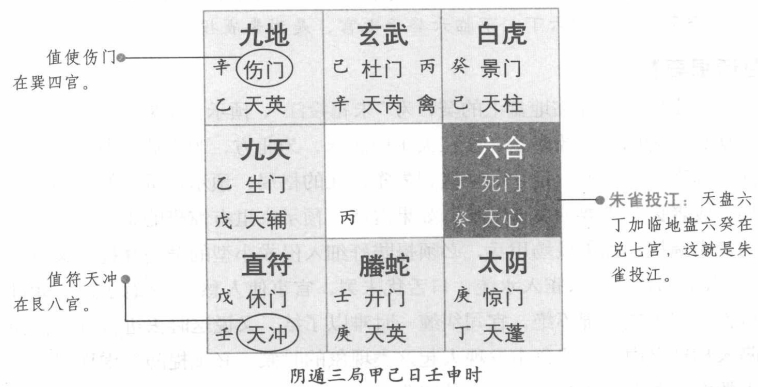 【原文】 六丁加癸雀入江。 【原注】丁属火,为朱雀,癸属水,故丁加癸为朱雀入江,《奇门大全》云:“丁加癸,主文书牵连,或失脱文书,占家有惊恐,怪异梦 用兵防奸。”王璋曰:“天上六丁,加地下六癸,名朱雀投江。此时百事皆凶。六丁加六癸,朱雀入水流。口舌犹未罢,官事使人愁。又曰:“或有诉讼,自陷刑狱。或闻火起,不必往救。”假令夏至中元阴遁三局,甲已日壬申时,此时六丁在六宫,以值符天冲,加时干六壬于八宫,即六丁,下临六癸于七宫,是为朱雀投江也。 【白话提要】 天盘上的六丁加临地盘上的癸,为“朱雀投江”,预示百事皆凶。因为丁在天干中属火,为南方,为朱雀;癸在天干中属水,为北方,为玄武,所以说是“雀入江”。《奇门大全》上说,如果遇到朱雀投江的格局,预示在重要的文书方面有牵连,或者丢失重要的文件书信;如果占测,预示家里有惊恐的事发生,或有怪异的梦来骚扰;如果战场用兵,必须提防奸细入侵或小型的袭击骚扰。又有歌诀说:“六丁加六癸,朱雀入水流,口舌犹未罢,官事使人愁。”其意思是,此征兆是口舌是非仍然绵绵不绝,官司纠缠一时难以了结。又说这时去进行诉讼会使自己陷入刑狱之中;在战争中发现火起这类现象的时候,必须提防有虚诈之事,不必去救它。总之,雀类投入江中是凶兆。 比如夏至中元阴遁三局,甲、已日,壬申时,这时六丁排布在乾六宫,用值符天冲星加临时的天干六壬于民八宫,就可见六丁下临六癸于兑七宫的局象,这种格局就是“朱雀入江”。 朱雀投江格 奇门遁甲中的朱雀投江格是指天盘六丁加临地盘六癸,此时百事皆凶。下面就详细解说其局象,并示例加以说明。 |