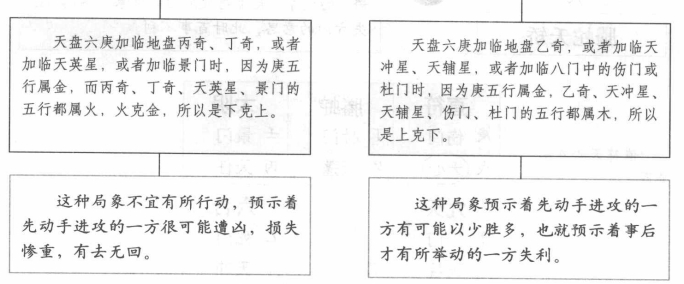 【原文】 更有一般奇格者,六庚谨勿加三奇。 此时若也行兵去,匹马只轮无返期。 【原注】 六庚加丙丁奇,天英景为下克上,先举者凶,无返期。六庚加乙奇,冲辅伤杜上克下,先举者胜。匹马只轮,能敌万人。 【白话提要】 在奇门遁甲的布局和演局时,如果天盘六庚加临地盘乙、丙、丁三奇,为奇格。这种情况下如果行兵作战,据说会有一方大败亏输,弄到片甲不回的地步,所 谓“匹马只轮无返期”。奇门遁甲中遇到奇格的具体情况:六庚加临三奇中的丙奇、丁奇,或者加临天英星,或者加临景门,以上这几种格局都是“下克上”,不宜有所行动,预示着先动手进攻的一方很可能遭凶,损失惨重,有去无回。反之,六庚如果加临三奇中的乙奇,或者加临天冲星、天辅星,或者加临八门中的伤门或杜门,这几种格局都是“上克下”,据说这种局象预示着先动手进攻的一方有可能以少胜多。也就预示着事后才有所举动的一方失利。 详解奇格 奇门遁甲中有奇格,此格是天盘六庚加临地盘乙、丙、丁三奇,此时如果行兵作战,会有一方大败,甚至会到片甲不回的地步。 |