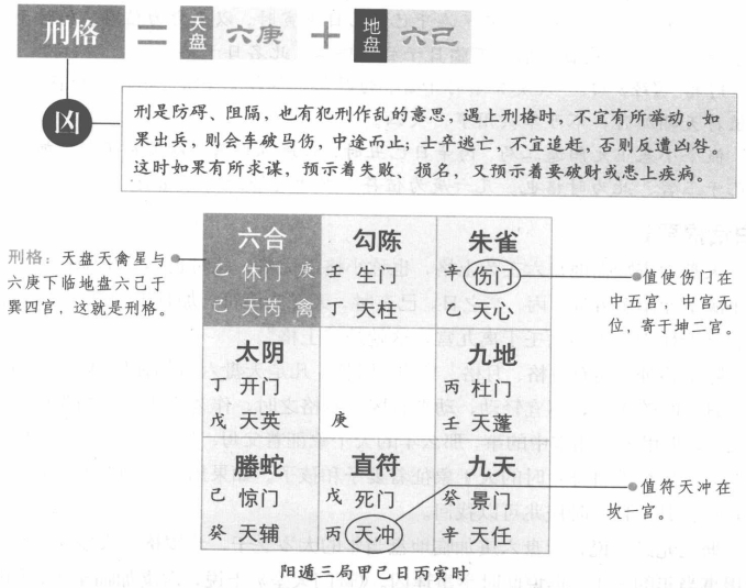【原文】 加已为刑最不宜。 【原注】 六庚加六已,赤地须千里;远行车马堕,军兵半路止。汤谓曰:“六庚加六已为刑格,谓天上六庚,加地下六已,此时出军,车破马伤,中道而止,士卒逃亡,慎勿追之,返招凶咎。”《奇门大全》云:“六庚加六已,求谋主失名,破财、疾病。”假令大寒上元阳遁三局,甲己日丙寅时,此时六庚在五宫,寄二宫,以值符 天冲加时干六丙于一宫,即得天禽,为六庚,下临六已于四宫,此名刑格。 【白话提要】 天盘六庚加临地盘六已为刑格。刑是防碍、阻隔,也有犯刑作乱的意思。据说此时不宜有所举动,如果出兵,则会车破马伤,中途而止;士卒逃亡,还不宜追赶,否则反遭凶咎。有歌诀说:“六庚加六已,赤地须千里,远行车马堕,军兵半路止。”《奇门大全》上说:“天盘六庚加会地盘六己,这时如果有所求谋,预示着失败、损名,又预示着要破财或患上疾病。 比如大寒上元阳遁三局,甲、己之日,丙寅时,这时六庚排布在中五宫,无位,寄处于坤二宫,用值符天冲星加临时干六丙于坎一宫,就可得天禽星与六庚下临地盘六已于巽四宫的局象,这种格局就是“刑格” 刑格详解 奇门遁甲中有刑格,此格是天盘六庚加临地盘六已,据说此时不宜有所举动,如果出兵,则会车破马伤,中途而止;士卒逃亡,还不宜追赶,否则反遭凶咎。 |
