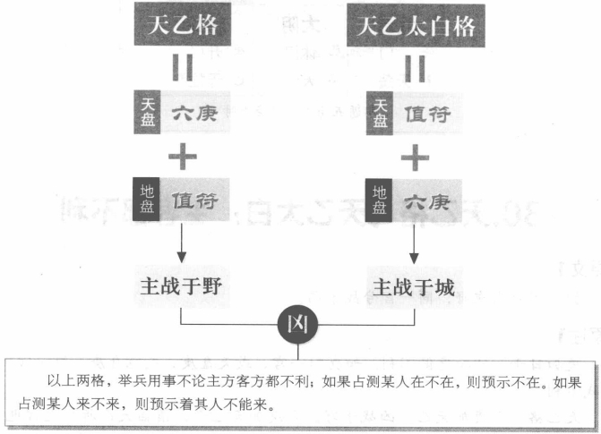 【原文】 加一官兮战在野,同一官兮战于国 【原注】 庚加日干,日加庚俱不利。如庚加一宫,或天盘庚,或地盘庚,同一宫,皆主战不利。 天乙格,六庚加天乙,凶战于野。六庚加天乙者,谓临天乙所居之宫也。天乙太白格,谓天乙与六庚同宫,战于国凶,天乙与六庚同宫者,谓天乙、值符与六庚同行,加时与太白格,利野斗。若值符加六,宜固守伏藏。凡通诸格之时,用兵主客俱不利,占人在否,格则不在,占人来否,格则不来。 【白话提要】 以上所讲的六庚的性质,不论是六庚加临用事之日的天干,还是用事之日的天干加临六庚,都是不吉利的征兆。这里再进一步阐述,讲的是六庚与值符发生的情况。“加一宫”指天盘六庚加临地盘值符,称为天乙格;“同一宫”指以甲申庚为值符,称为天乙太白,值符与六庚同行,加于地盘时干所在之宫。“加一宫主战斗于郊野,凶;“同一宫”主战斗于城邑,亦凶,主客都不利。以上两格,举兵用事不论主客,都不利。如果占测某人在不在,遇格,则预示不在。如果占测某人来不来,遇格,则预示着其人不能来。 天乙格与天乙太白格 天乙格与天乙太白格讲的是六庚与值符发生的情况,此两格都是凶格,举兵用事主客都不利。 |