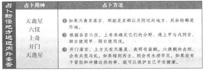 【原文】 天禽落官为帝畿,余为外地。各官六仪、上奇定其分野,遇甲、戊同官,阳日用甲,阴日用戊。开门落官,上有天蓬,则主盗贼。六庚向击,兵乱为荒。丙壬若遇,水涝旱灾。不犯此者,自保安康。定州分野,各以本邦,或远或近,细审地方。 【白话提要】 占新任地方远近内外安否时,如果天禽星落宫,那就是京都以及附近的地方其余的都是外地。根据各宫六仪、上奇来确定它们的分野。遇上甲与戊同宫,阳日使用甲,阴日使用戊。开门落宫,上方又有天蓬星,表明有盗贼。六庚朝向击刑,会有兵荒马乱。如果碰到丙壬,则会有水涝早灾。如果没有干冒犯和冲撞这些的事,就可以保护自己平安健康。各自根据本邦方位,确定州界分野,或者在远处,或者在近处,应该细审所在的地方。 白话图解 占卜新任地方远近内外安否之法 此信息最后更新时间为:2015-11-4 00:00