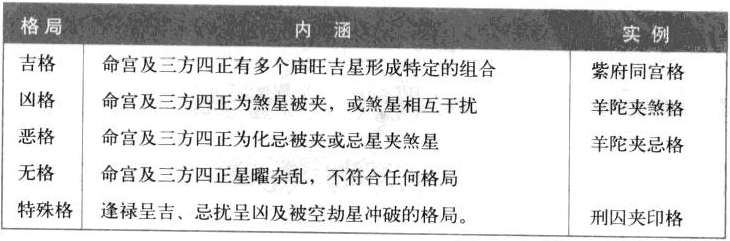 紫微斗数之格局,是指某类星在某些宫位,以及某类星与某类星同宫或加会等等情况,根据这种种组合,可以将命盘归属于某一类型的命运,或凶或吉、或贫或富、或贵或贱、或吉凶皆有等。格局的大小和好坏,影响人一生的命运。 所谓格,就是格调,是人出生时所处的环境,即当时宇宙磁场所形成的空间之条件在命理上则为命运的架构;局,就是局限,在命理上则为命运时间条件所形成的局势。人的命盘有时是一种格局,同时它又可归于另一种格局,有时一个命盘组合可能会有几种格局。定格局时在大多数情况下一定要以命宫三方四正来定,而不能把夫妻、子女仆役、疾厄等宫位用来分析出格局。 从命理上看,格局就是将各种命运变化的架构,依其时空环境、特质与局势,归纳成好或坏的模式,以便分析与研究。紫微斗数所归纳出的几本命格模式有一百多种,其中包括吉格、凶格、恶格、无格几大类。一般而言,一个人的命盘所得吉格越多,其人之富贵层次当然就越高,成就也就越大。丰功伟业的人,其命理一定有一种以上好的格局;贫贱愚劣的人,其命理一定也有一种以上坏的格局;只有庸庸碌碌,一生平淡无奇的人,才不符合任何好或坏的格局。因此,格局的大小和好坏,影响人一生的命运甚大,其重要性不言而喻。 与此同时,格局若为忌煞所扰,破失难免,尤以凶格、恶格最为难缠,必生灾祸;命不成格亦不用担心,行运若走入成格又被吉化的运程,亦有成功的条件与机缘。命若成格,禄在何处,成就随之出现;若成凶格或恶格,忌到之处,破失随之而来,煞星扰乱,亦有逞凶之可能。凶格危机四伏;恶格灾难不断,三方忌煞,四面楚歌。因应之道,除非知命而运命,否则只能以静制动。因此,凶格、恶格若运用得当、亦可见其成,若能反其道而行(如从事破坏性之行业,如考古、古文学、宗教、哲学、命理解读、仙佛神鬼之行业皆极适格),亦可相安无事,行运若得吉化或吉辅,禄星所到之处皆可见其成。 研习与运用紫微斗数,要对其命格进行详尽的了解,本书将在下章结合实例对之进行阐释。 命盘格局 命盘格局是紫微斗数中一个重要的概念.是统计分析学在紫微斗数中的具体应用。它将各种命运变化,根据时空条件与特质,归纳成好或坏的模式。这种归纳大大便利了人们对于命理的分析与论断。 格局的释义 从命理上看,格局就是将各种命运变化的架构,依其时空环境、特质与局势,归纳成的各种模式。 格局的种类 |