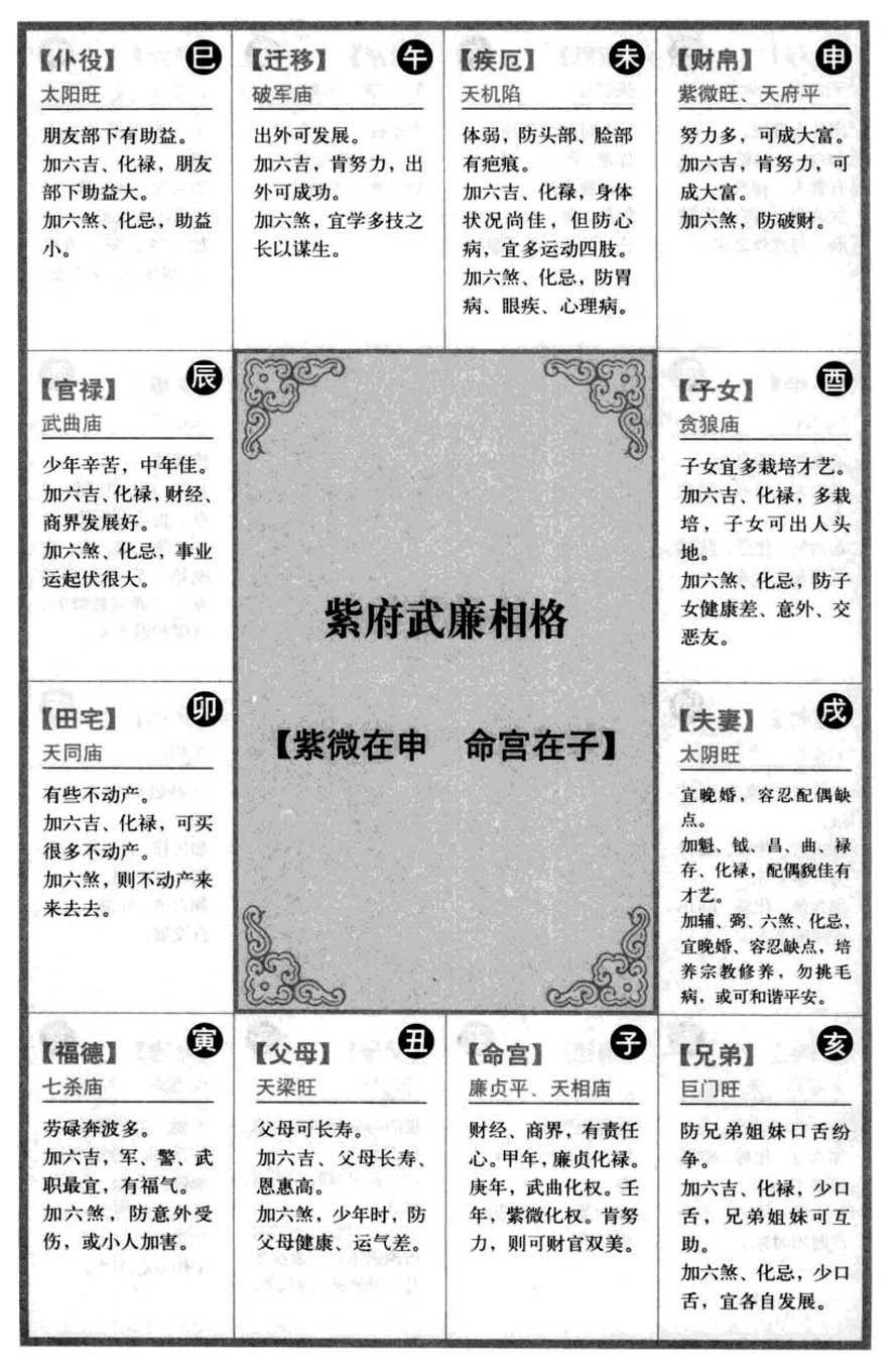 紫府武廉相格【紫微在申命宫在子】 【仆役宫】太阳旺 朋友部下有助益。 加六吉、化禄,朋友部下助益大。 加六煞、化忌,助益小。 【官禄宫】武曲庙 少年辛苦,中年佳。 加六吉、化禄,财经、商界发展好。 加六煞、化忌,事业运起伏很大。 【田宅宫】天同庙 有些不动产。 加六吉、化禄,可买很多不动产。 加六煞,则不动产来来去去。 【福德宫】七杀庙 劳碌奔波多。 加六吉,军、警、武职最宜,有福气。 加六煞,防意外受伤,或小人加害。 【迁移宫】破军庙 出外可发展。 加六吉,肯努力,出外可成功。 加六煞,宜学多技之长以谋生。 【疾厄宫】天机陷 体弱,防头部、脸部有疤痕。 加六吉、化粶,身体状况尚佳,但防心病,宜多运动四肢。 加六煞、化忌,防胃病、眼疾、心理病。 【父母宫】天梁旺 父母可长寿。 加六吉、父母长寿、恩惠高。 加六煞,少年时,防父母健康、运气差。 【命宫】廉贞平、天相庙 财经、商界,有责任心。甲年,廉贞化禄。 庚年,武曲化权。壬年,紫微化权。 肯努力,则可财官双美。 【财帛宫】紫微旺、天府平 努力多,可成大富。 加六吉,肯努力,可成大富。 加六煞,防破财。 【子女宫】贪狼庙 子女宜多栽培才艺。 加六吉、化禄,多栽培,子女可出人头地。 加六煞、化忌,防子女健康差、意外、交恶友。 【夫妻宫】太阴旺 宜晚婚,容忍配偶缺点。 加魁、钺、昌、曲、禄存、化禄,配偶貌佳有才艺 加辅、弼、六煞、化忌、宜晚婚、容忍缺点,培养宗教修养,勿挑毛病,或可和谐平安。 【兄弟宫】巨门旺 防兄弟姐妹口舌纷争。 加六吉、化禄,少口舌,兄弟姐妹可互助。 加六煞、化忌,少口舌,宜各自发展。 此信息最后更新时间为:2024-11-18 11:55