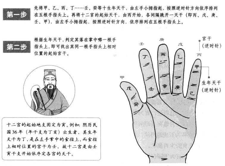斗数命盘的排列是学习与运用紫微斗数的难点,本节将配合表格具体介绍推查星曜和排命盘的具体步骤与方法,方便简捷,同时为了帮助有志精研斗数者摆脱书本,也提供了用掌指和心算排盘的方法 按下述各步骤,在空白命盘图上一步一步地进行操作,即可完成命盘图的制作。分两种推算方法,一是查表法,方便查阅,二是口诀方式,方便记忆。前者适合人门者,后者适合专业人士及有志于研究紫微斗数的人士,读者根据自身需要任选其中一法即可。 第一步:定十二宫天千 歌诀一:五虎遁月法 甲己之年起丙寅(甲或已年出生者,正月起丙寅) 乙庚之年起戊寅(乙或庚年出生者,正月起戊寅) 丙辛之年起庚寅(丙或辛年出生者,正月起庚寅) 丁壬之年起壬寅(丁或壬年出生者,正月起壬寅) 戊癸之年起甲寅(戊或癸年出生者,正月起甲寅) 歌诀二: 甲己丙作首,乙庚戊为头; 丙辛从庚起,丁壬壬行流; 戊癸何处觅,甲寅好追求。 说明: 1.以寅宫开始各安宫支的理由有二: (1)子开天、丑辟地、寅为人始。 (2)阴历以正月建寅(即阴历正月的地支固定为寅)。2.本歌诀称为五虎遁月法,其理由为: (1)地支寅的生肖属虎。 (2)定十二宫天干即在认定生月的地支(年上起月)。 (3)一般人排斗数命盘,直接查看本章各相关表格即可轻易地排妥命盘,而不用去理各相关的法则、掌中诀、图例和歌诀。命相专业人员,或有志于精研斗数命理的人必须熟记排盘的各相关法则、掌中诀、歌诀和图例,才能不需要翻看书籍,就能迅速排妥命盘。 定宫干掌中诀 查表的方法虽然简单,但有志于研习命理的人不可总是携带着表格。这时,我们就可以运用掌中诀定宫干,只要熟记于心,这种方法随时随地都可以使用,十分方便。 综合实例 紫微斗数排盘程序繁复,前后步骤相互关联,如有一步差之毫厘,结果可能就会谬以千里。故此,本书以吴斯人先生(阴历一九四七年十二月二十七日清晨五点二十六分出生。)为例从排盘的准备工作开始作示范说明。 此信息最后更新时间为:2024-11-14 22:56 |
