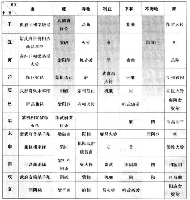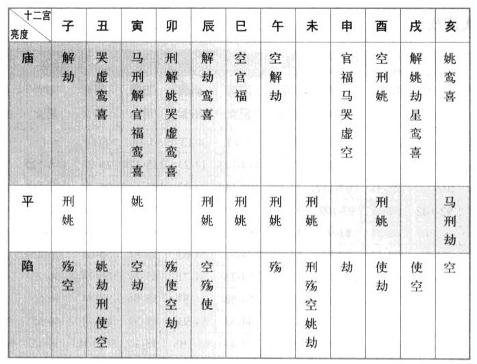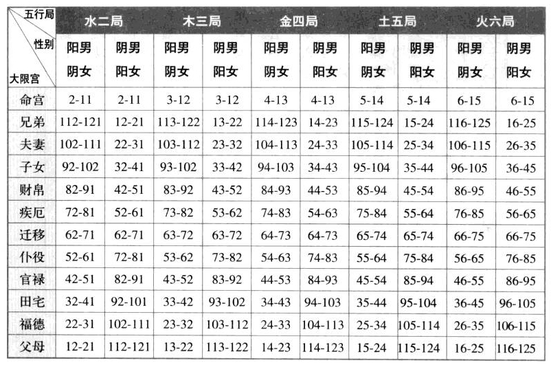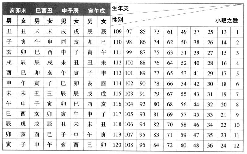 第二十二步:起大限 歌诀: 大限初行起命宫,十年一度换行宫; 阳男阴女顺方转,阴男阳女逆行通; 若问行限何岁起,五行局数为其宗, 各宫甲级诸星曜庙旺利陷表 说明: 大限主十年吉凶,在命盘中每十年换一宫,第一大限皆在命宫,自第二大限起,依阳男阴女顺行,阴男阳女逆行的原则,依序排在命盘各宫。起限年岁则依五行局而定,即水二局人以两岁至十一岁为第一大限;木三局人则以三岁至十二岁为第一大限;火六局人以六岁至十五岁为第一大限。 各宫乙级诸星曜庙旺利陷表 第二十三步:起小限 起小限歌诀: 小限一年一度逢,男顺女逆不相同; 寅午成人辰上起,申子辰人自成宫; 已酉丑人未宫始,亥卯未人起丑宫。 说明: 小限主一年祸福,一年换一宫,男顺行,女逆走。生年支为寅、午、戌人自辰宫起·岁,生年支为申、子、辰人自戌宫起一岁,生年支为巳、酉、丑人自未宫起一岁,生年支为亥、卯、未人自丑宫起一岁。 起大限表 起大限表 此信息最后更新时间为:2024-11-14 22:56 |