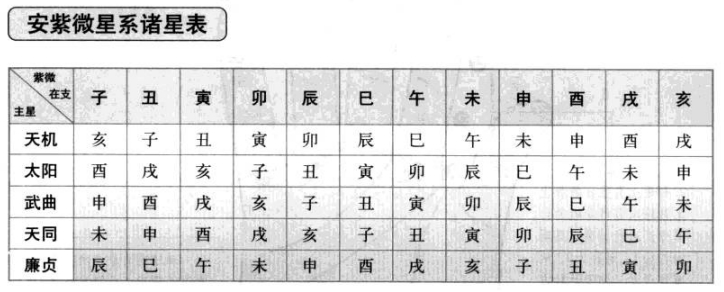 第五步:安紫微星 计算紫微星宫位法则 法则一 生日数可以被五行局数整除时: 生日数÷局数=商数 (局数:水2.木3.金4.土5.火6) 安紫微星掌中诀实例 安紫微星同样可以运用掌中诀。以下仍沿用之前吴斯人先生的实例作说明(阴男,丁亥年十二月二十七日卯时生,五行为金四局)。 由寅宫顺数商数,所临宫位安紫微星。法则二生日数不能被五行局数整除时:(生日数+某数)÷局数=商数 1.所加某数为奇数时: 由寅宫顺数商数,再由所临宫位逆数某数后,安紫微星。 2.所加某数为偶数时: 由寅宫顺数商数,再由所临宫位顺数某数后,安紫微星: 第六步:安紫微星系诸星 歌诀: 紫微天机星逆行,隔一阳武天同情;又隔二宫廉贞位,空三复见紫微亭。 速简歌缺: 紫机逆行,隔一阳武同; 隔二廉贞;隔三回紫宫 说明: 紫微星的宫位逆行一位就是天机星的宫位,天机星的宫位逆行隔一宫则为太阳星的宫位,接着逆行各一宫位分别安下武曲星和天同星,又逆行隔二宫就是廉贞星的宫位,再空三宫又复回而见到了紫微星所在的宫位了。 第七步:安天府星 歌诀: 局定生日逆布紫,对宫天府顺行流;唯有寅申同一位,其余壬卯互安星。 说明: 1.天府星除了寅、申二宫与紫微星同座外,其余各宫皆与紫微星相对。 2.将紫、府同座的寅、申二宫连成一直线,遂将命盘一分为二,紫微星居右、天府星就居左,紫微星安左、天府星就安右。 3.将紫、府相对宫距最远的巳、亥二宫连成一线,其余紫、府相对二宫皆与巳亥线相平行。 此信息最后更新时间为:2024-11-14 22:56 |