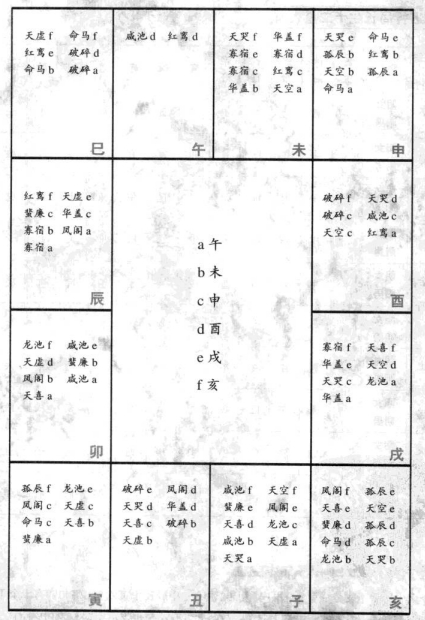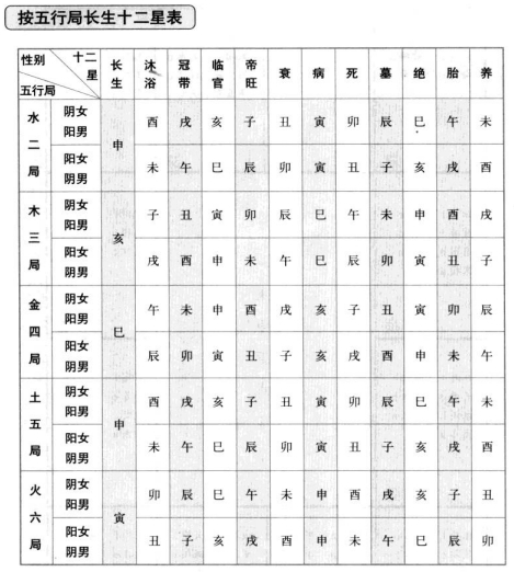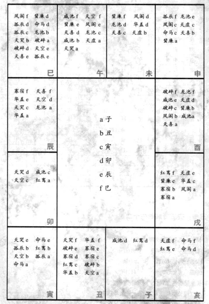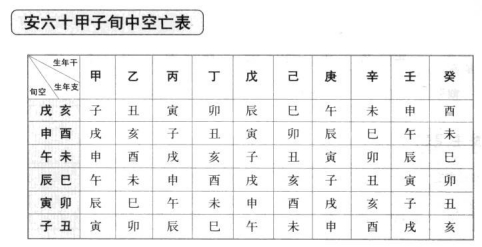 第十五步:安五行局长生十二星 说明: 1.长生十二星的排列顺序依次为: (1)长生(2)沐浴(3)冠带(4)临官(5)帝旺(6)衰(7)病(8)死(10)绝(11)胎(12)养 2.长生星所在之宫位,依五行局而定: 水二局长生星在申 木三局长生星在亥 金四局长生星在已 土五局长生星在申 火六局长生星在寅 年支星命盘图 3.依五行局安妥长生星的宫位后,再按长生十二星的排列顺序,阳男阴女顺时针安之,阴男阳女逆时针安之。 第十六步:安六十甲子旬中空亡 六十甲子干支分成甲子、甲戌、甲申、甲午、甲辰及甲寅六旬,每句皆有十个干支因地支应有子、丑、寅……亥十二个,故每旬各有二个地支落空,称为旬中空亡。 第十七步:安截路空亡 歌诀: 甲已之岁空申酉,乙庚之岁午未求; 丙辛生命空辰已,丁壬寅卵最堪忧; 戊癸生人空子丑,命犯空亡万事休。 截路空亡简称截空,阳干见阳支、阴干见阴支为正截空,阳干见阴支、阴干见阳支为傍截空。例如,年干为甲(阳干)生人,申(阳支)为正截空;西(阴支)为傍截空。年干为已(阴干)生人,西(阴支)为正截空、申(阳支)为傍截空。 此信息最后更新时间为:2024-11-14 22:56 |