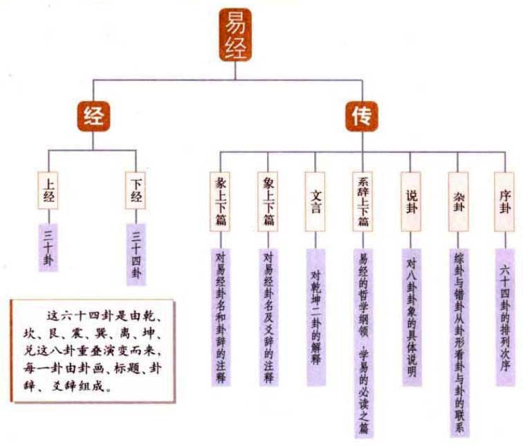 | 《易经》的内容 经和传 《易经》包括《经》和《传》两部分内容 《经》分为《上经》和《下经》,《上经》三十卦,《下经》三十四卦,一共六十四卦。每一卦由卦画、标题、卦辞、爻辞组成。六十四卦是由乾、坎、艮、震、巽、离、坤、兑这八卦重叠演变而来的。每个卦画都有六爻,爻分阴阳,阳性称为“九”,阴性称为“六”。从下向上排列成六行,依次叫做初、二、三、四、五、上。六十四个卦画共有三百八十四爻。标题与卦辞、爻辞的内容有关。卦辞在爻辞之前,一-般起说明题义的作用。爻辞是每卦内容的主要部分,根据有关内容按六爻的先后层次安排。 《传》一共七种十篇,分别是:《象(tuàn)》上下篇、《象》上下篇、《文言》《系辞》上下篇、《说卦》、《杂卦》和《序卦》。 古人把这十篇“传”叫做“十翼”,意思是说“传”是附属于“经”的羽翼,即用来解说“经”的内容的。 《象》是专门对《易经》卦名和卦辞的注释, 《象》是对《易经》卦名及爻辞的注释。 《文言》则对乾、坤二卦作了进一步的解释,《系辞》是《易经》的哲学纲领,其内容博大精深,是学易的必读之篇。《系辞》是易传十篇中最重要、最有代表性的文字。它是我国古代第一部对易的产生、原理、意义及易卦占法等的全面、系统的说明。它发了许多从易经本文中看不到的思想。《系辞》与《象》、《象》不同,它不是对易经的卦辞、爻辞的逐项注释,而是对易经的整体评说。 《说卦》是对八卦卦象的具体说明。是研究术数的理论基础之一《杂卦》则将六十四卦以相反或相错的形态排成两两相对的综卦和错卦,从卦形中看卦与卦之间的联系。 与《杂卦》研究的角度不同,《序卦传》则讲述了六十四卦的排列次序总起来看,《传》的作者的主要目的是借解说经文来表达自己的思想观点。 《经》和《传》《易经》不可分割的两部分内容 《易经》包括《经》和《传》两部分内容。《经》分为《上经》和《下经》,一共六十四卦。《传》一共七种十篇,古人将这十篇“传”叫做“十翼”,意思是说“传”是附属于“经”的羽翼,即用来解说“经”的内容的。 为什么《系辞》是学易的必读之篇呢? 因为它是我国古代第一部对易的产生、原理、意义及易卦占法等的全面、系统说明。是《易经》的哲学纲领,阐发了许多从《易经》本文看不到的思想。 上经:30卦,下经34卦。这六十四卦是由乾、坎、艮、震、巽、离、坤、兑这八卦重叠演变而来,每一卦由卦画、标题、卦辞、爻辞组成。 此信息最后更新时间为:2024-10-30 15:33 |