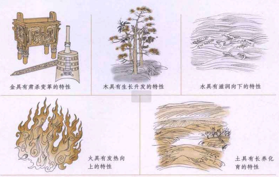 | 五行是指金、木、水、火、土。古人认为宇宙是由金、木、水、火、土这五种最基本的物质构成的,宇宙间各种事物和现象的发展、变化都是这五种不同属性的物质不断运动和相互作用的结果。 五行的概念,最早见于《尚书·洪范》:“五行,一日水,二曰火,三曰木,四曰金,五曰土。水曰润下,火日炎上,木曰曲直,金曰从革,土爰稼穑。”这里不但把宇宙间的各种事物分别归属于五行,并且对五行的性质与特征都做了界定。“木曰曲直”是说木具有生长、升发的特性;“火日炎上”是说火具有发热、向上的特性;“土爰稼穑”是说土具有长养、化育的特性;“金日从革”是说金具有肃杀、变革的特性;“水曰润下”是说水具有滋润、向下的特性。 此外,古人还认为,五行之间存在着相生相克的规律。相生,是指两类属性不同的事物之间互相滋生、相互促进的关系;相克,是指两类不同属性的事物间互相制约、克制和抑制。 五行相生 木生火:因为木性温暖,火隐伏其中,钻木而生火,所以木生火。 火生土:因为火能够焚烧木,木被焚烧后就变成灰烬,灰即土,所以火生土。 土生金:因为金隐藏在土里,聚土成山,有山必生石,石中藏金,所以土生金。 金生水:因为少阴之气(金气)温润流泽,金靠水生,销锻金也可变为水,所以金生水。 水生木:因为水温润而使树木生长出来,所以水生木。 五行相克 木克土:树木之根在泥土之中,可疏松土。 土克水:水多可用土来掩埋。 水克火:水可将火扑灭。 火克金:火可用以熔化金属。 金克木:金属制成的器具可用来削砍树木。 五行的相生相克,像阴阳一样,是事物不可分割的两个方面。没有生就没有事物的发生和成长;没有克,就不能维持事物的发展和变化中的平衡与协调。所以生中有克,克中有生,相反相成,互相为用。 此信息最后更新时间为:2024-10-30 15:36