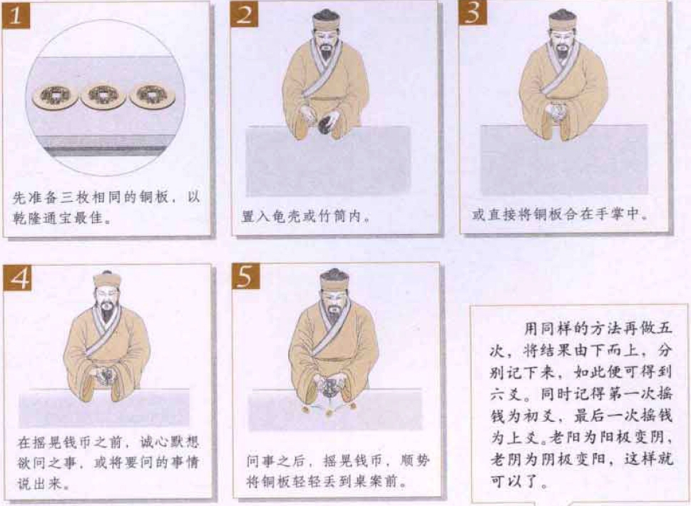 | 古人占筮用著草.通过三演十八变才求得一卦.其方法不但繁杂、浪费时间,还不易掌握,后人化繁为简,用铜钱摇掷的方法、代替丫古人复杂的蓍草布扑法这种以钱代著法,相传是战国时鬼谷子所创,金钱卦必须先准备三枚相同的铜板,以乾隆通宝最佳(如没有,也可用其他类似钱币)。 铜钱摇掷,化繁为简 古人占筮用蓍草,通过三演十八变才求得一卦,其方法不但繁杂,浪费时间,还不易掌握。后人化繁为简,用铜钱摇掷的方法,代替了古人复杂的蓍草布卦法。 将三枚铜板置入容器之内,传统以龟壳或竹筒为容器。或直接将铜板合在手掌中也可以。在摇晃钱币之前,口中诚心默想欲问之事,或将要问的事情说出来。问事之后,摇晃钱币,顺势将铜板轻轻丢到桌案前。在丢掷铜板之前,先定阴阳两仪。事实上,以哪一面为阴阳都没关系,只要事先定出阴阳之后,不要再反复改动即可。 此时三枚铜板会出现四种可能的情况。 第一种:三枚都是阳面,叫做老阳,记成O 第二种:三枚都是阴面,叫做老阴,记成x 第三种:一阴二阳时,叫做少阳,记成—— 第四种:二阴一阳时,叫做少阴,记成-- 看看自己的铜板是上述哪种情况,并记下结果。用同样的方法再做五次,将结果由下而上,分别记下来,如此便可得到六爻。 画卦时,从下往上画,从初爻至六爻,第一次摇钱为初爻,最后一一次摇钱为上爻。老阳为阳极变阴,老阴为阴极变阳。 |